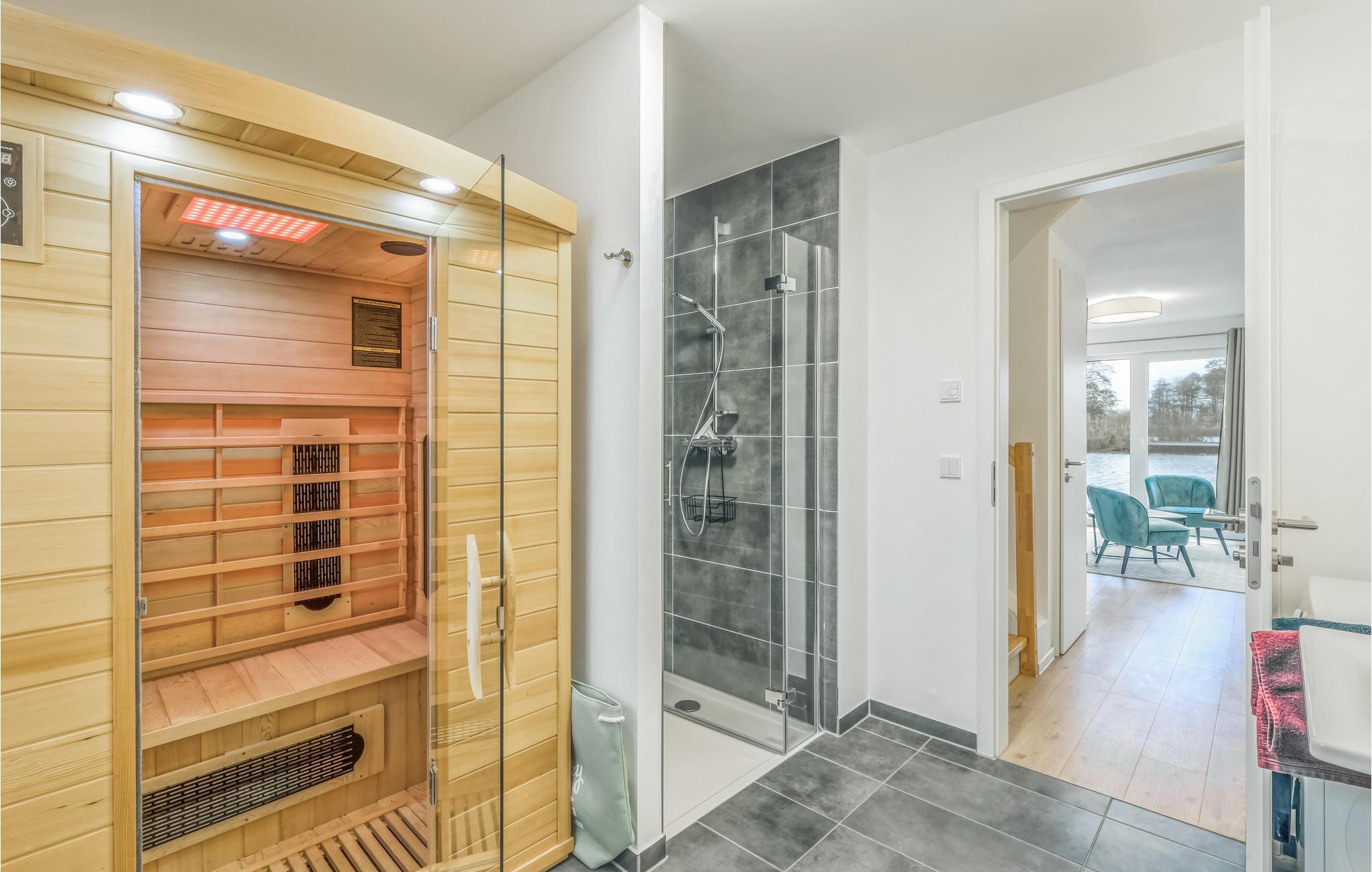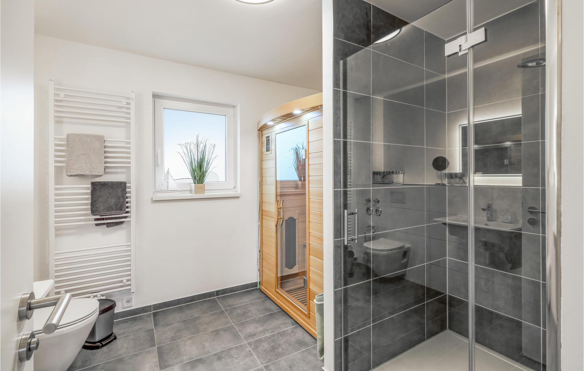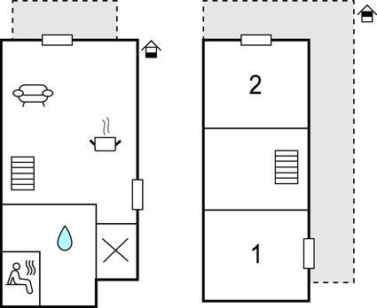 Ferieboligen udgør den ene halvdel af et dobbelthus og fordeler sig over to etager. I stueetagen er der et åbent, hyggeligt opholdsområde med tilstødende haveterrasse og et moderne køkken, som med høje vinduer udgør et lyst og behageligt rum. På kolde dage kan I sætte jer til rette foran brændeovnen. Ved siden af opholdsstuen er der et lyst badeværelse med brusekabine og infrarød sauna.