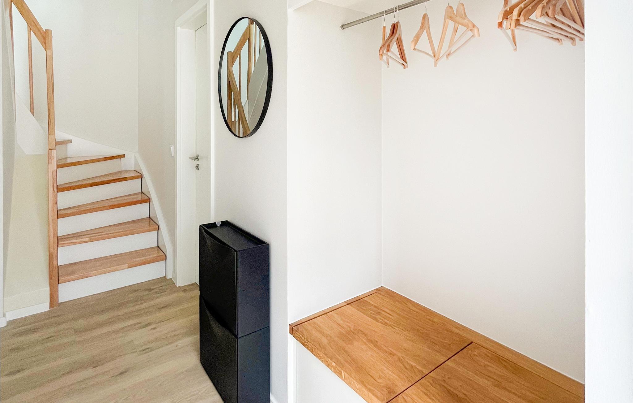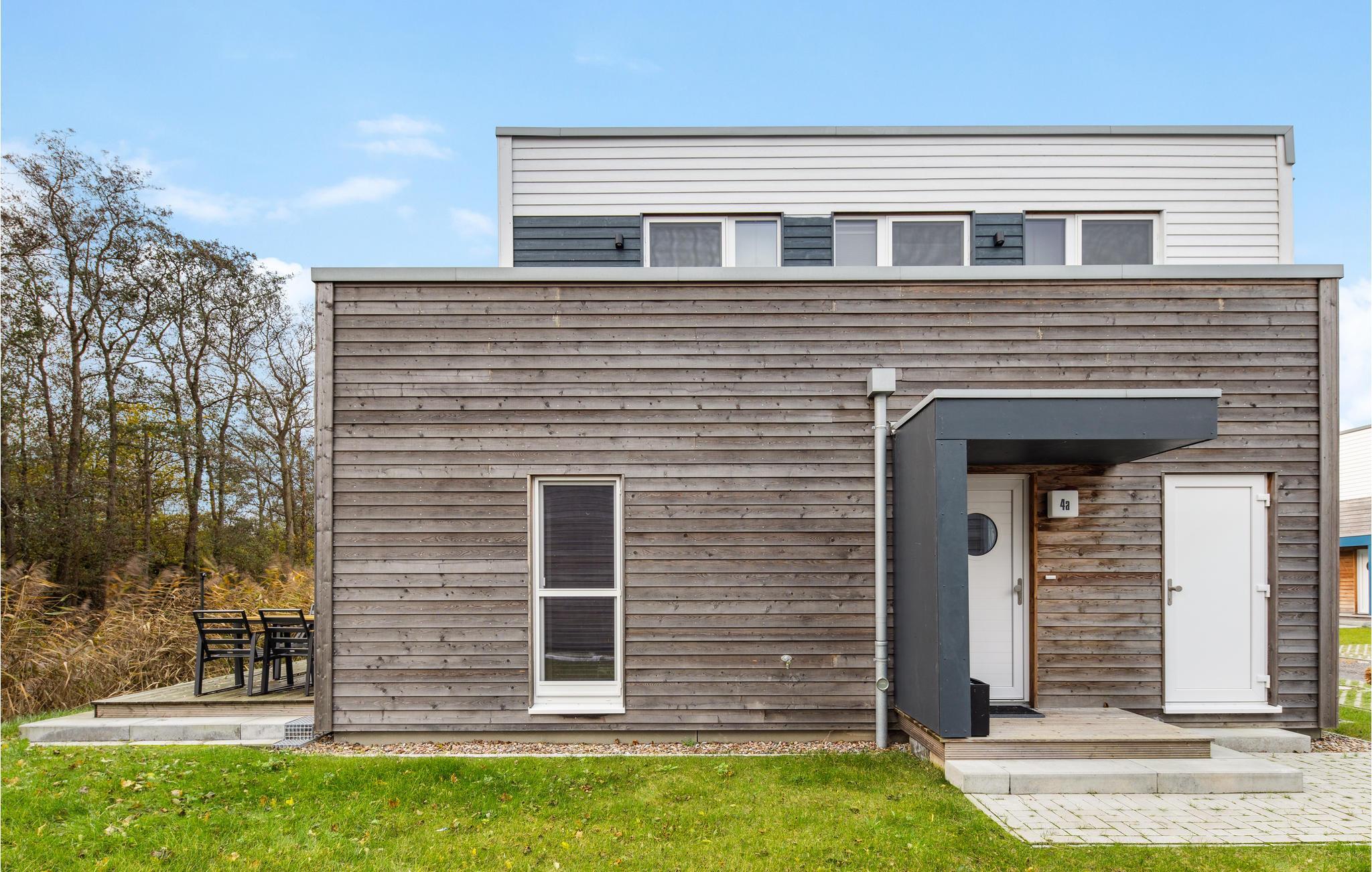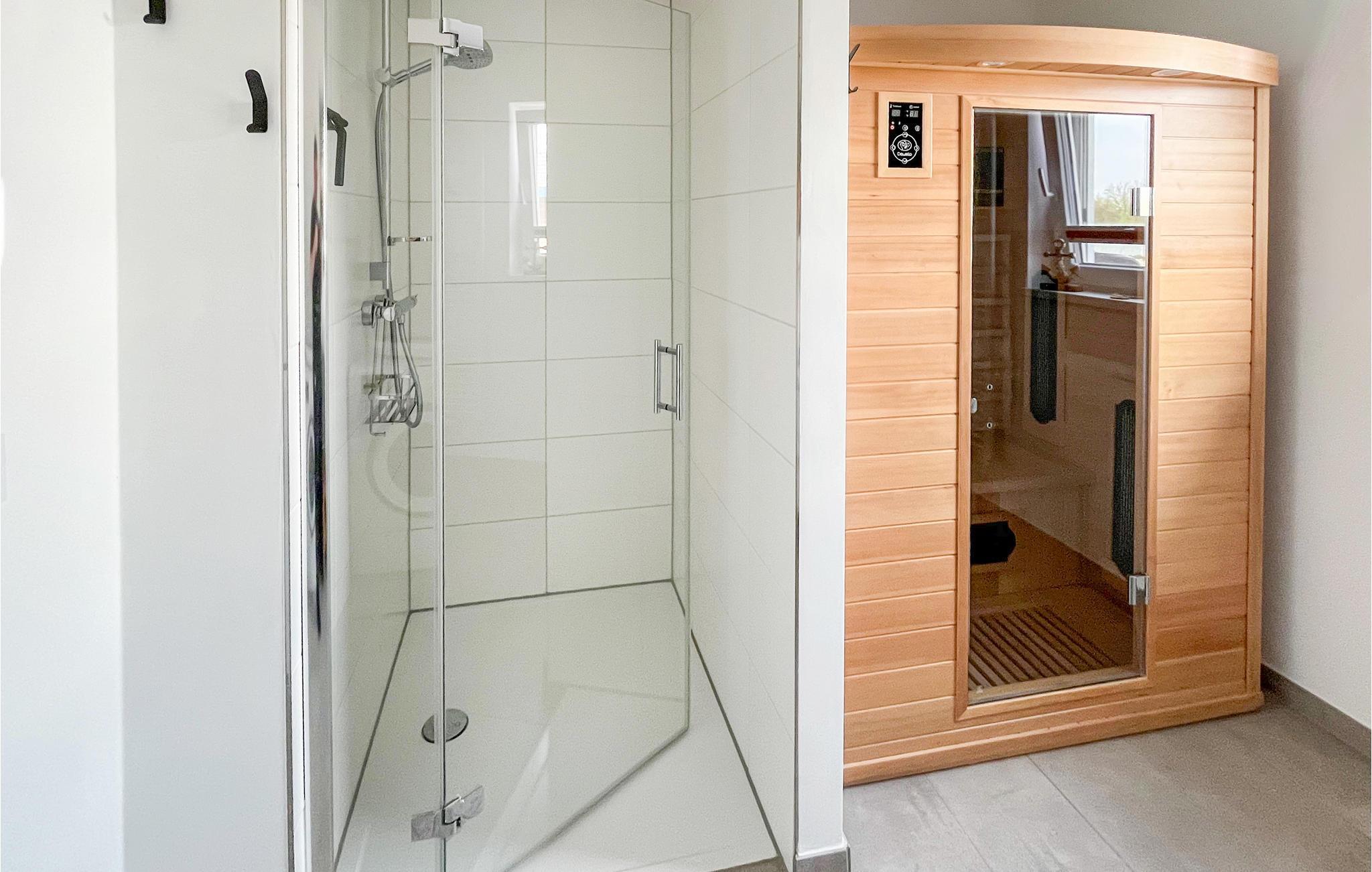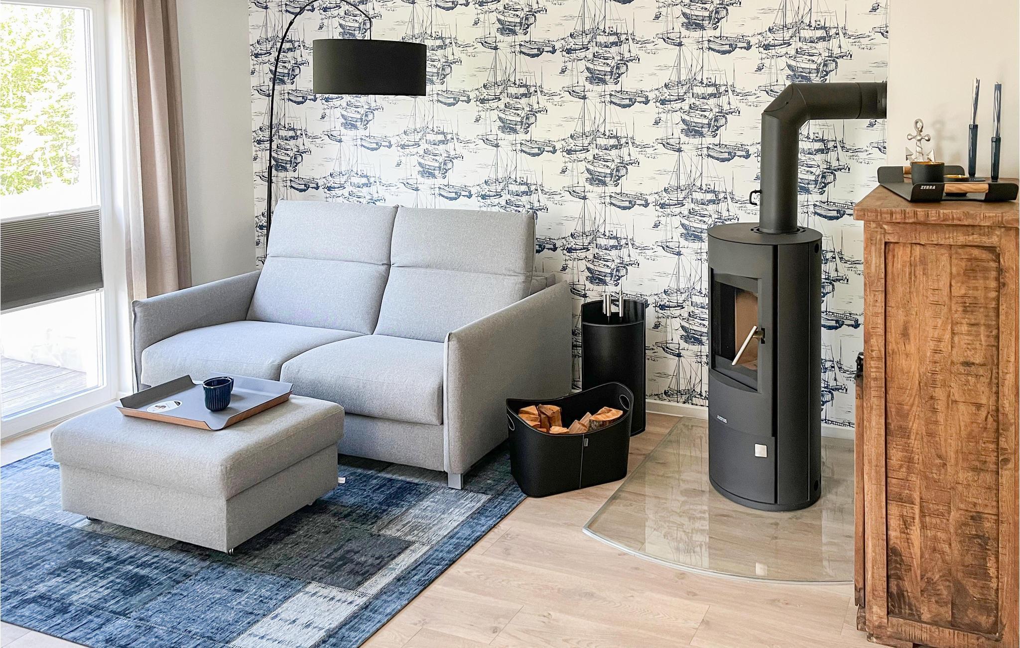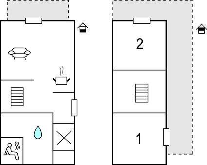 Dit hus strækker sig over 2 etager. I stueetagen er der en åben, hyggelig opholdsstue med en tilstødende haveterrasse og et moderne udstyret køkken, som inviterer til at dvæle gennem vinduerne fra gulv til loft. På kolde dage kan I finde jer godt tilpas foran den indbyggede pejs. Ved siden af opholdsstuen er der lyst badeværelse med brusekabine og infrarød sauna.