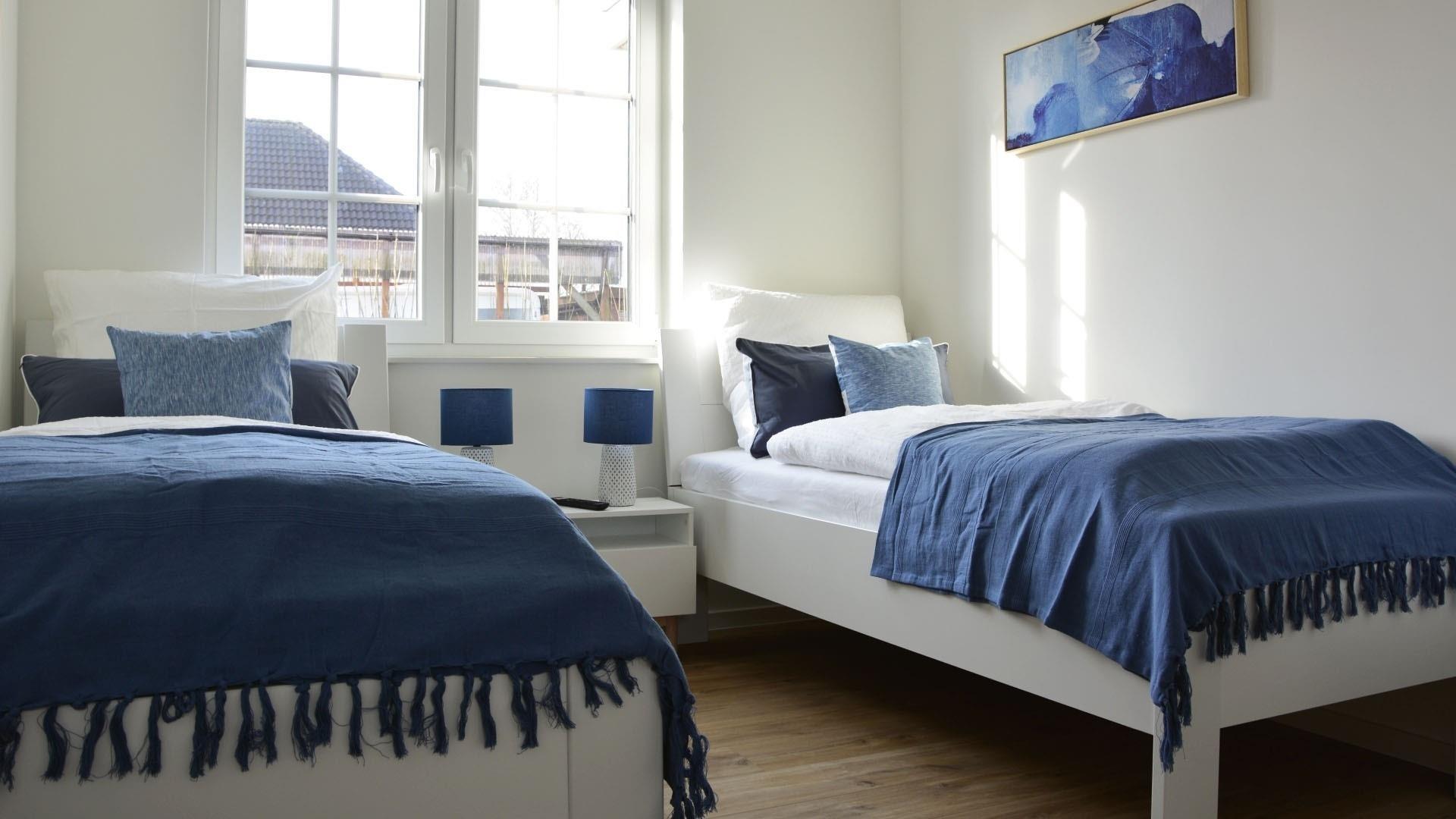 Zwei Schlafzimmern, ausgestattet mit 1 Boxspringbett (180x200 cm) & 2 Einzelbetten (100x200 cm) und Zusatz-TV.