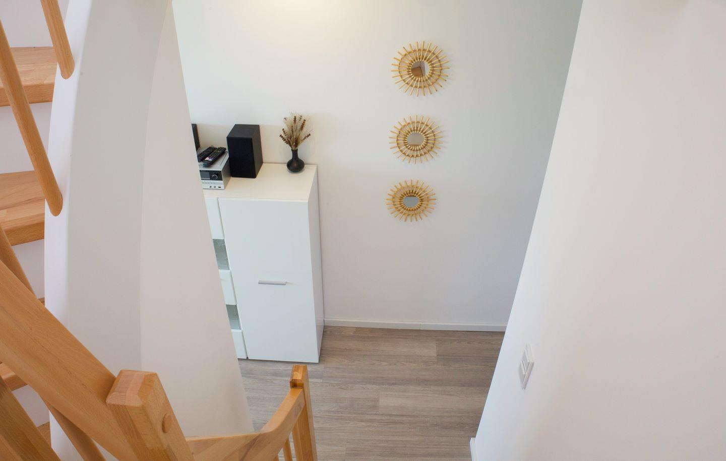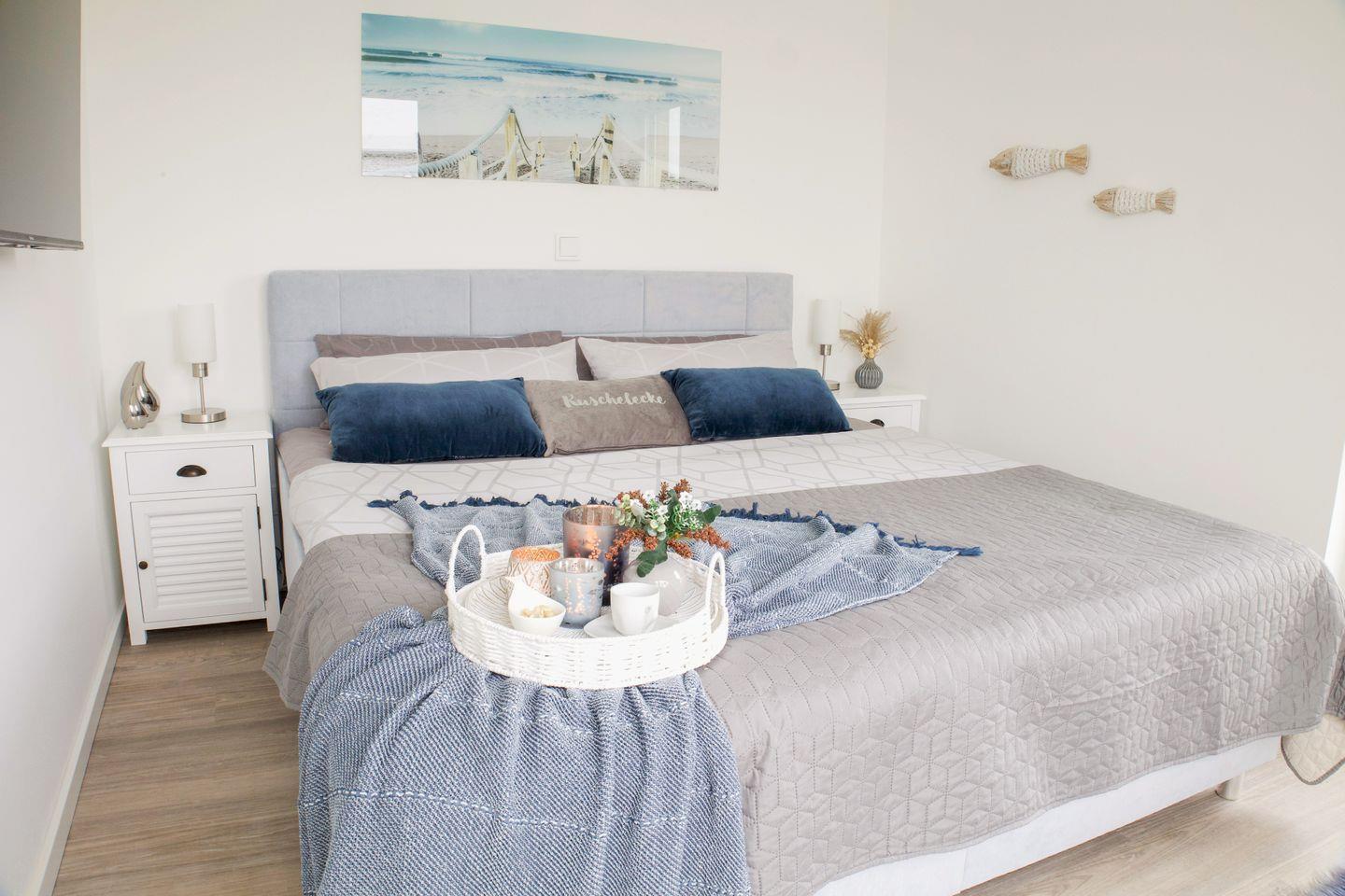 Das Erdgeschoss beherbergt ein Schlafzimmer mit zwei komfortablen Einzel-Boxspringbetten – ideal für Freunde oder Kinder. Im Obergeschoss schläfst du im gemütlichen Doppel-Boxspringbett. Beide Schlafzimmer verfügen über einen Smart-TV, Verdunkelungsplissees und liebevolle Details für ein rundum wohnliches Ambiente.