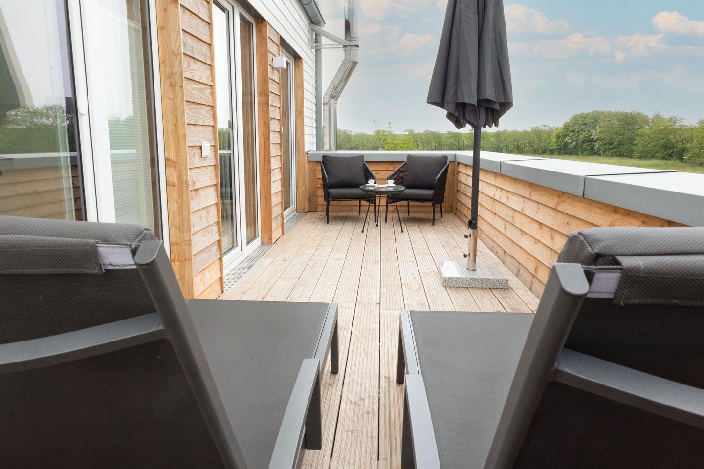 Meerzeit Tossens – Urlaub mit Hund. Dachterrasse. Deichblick.