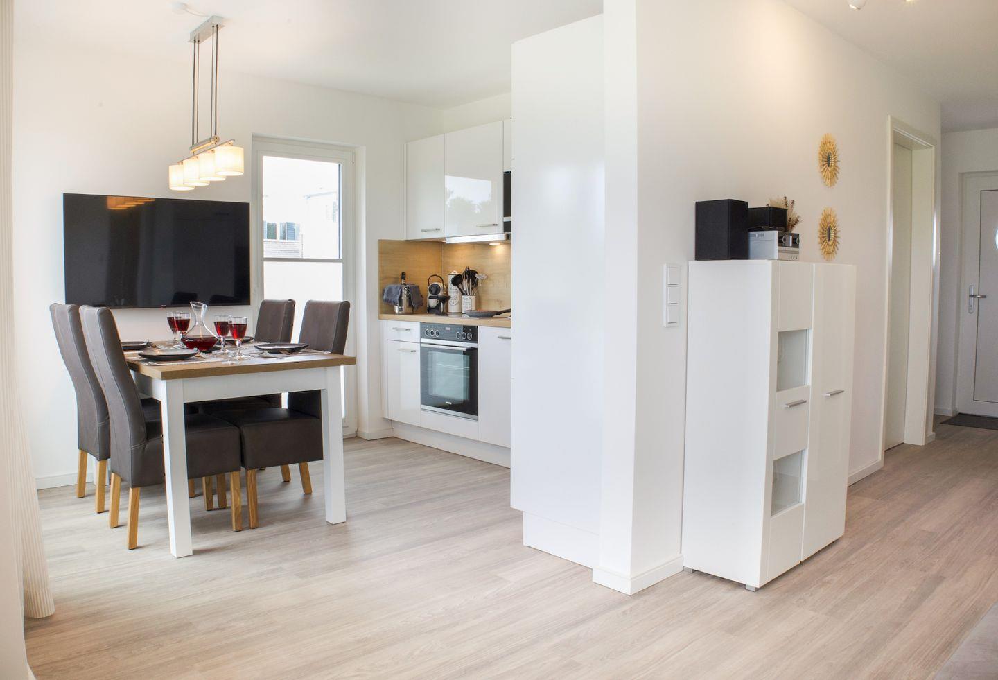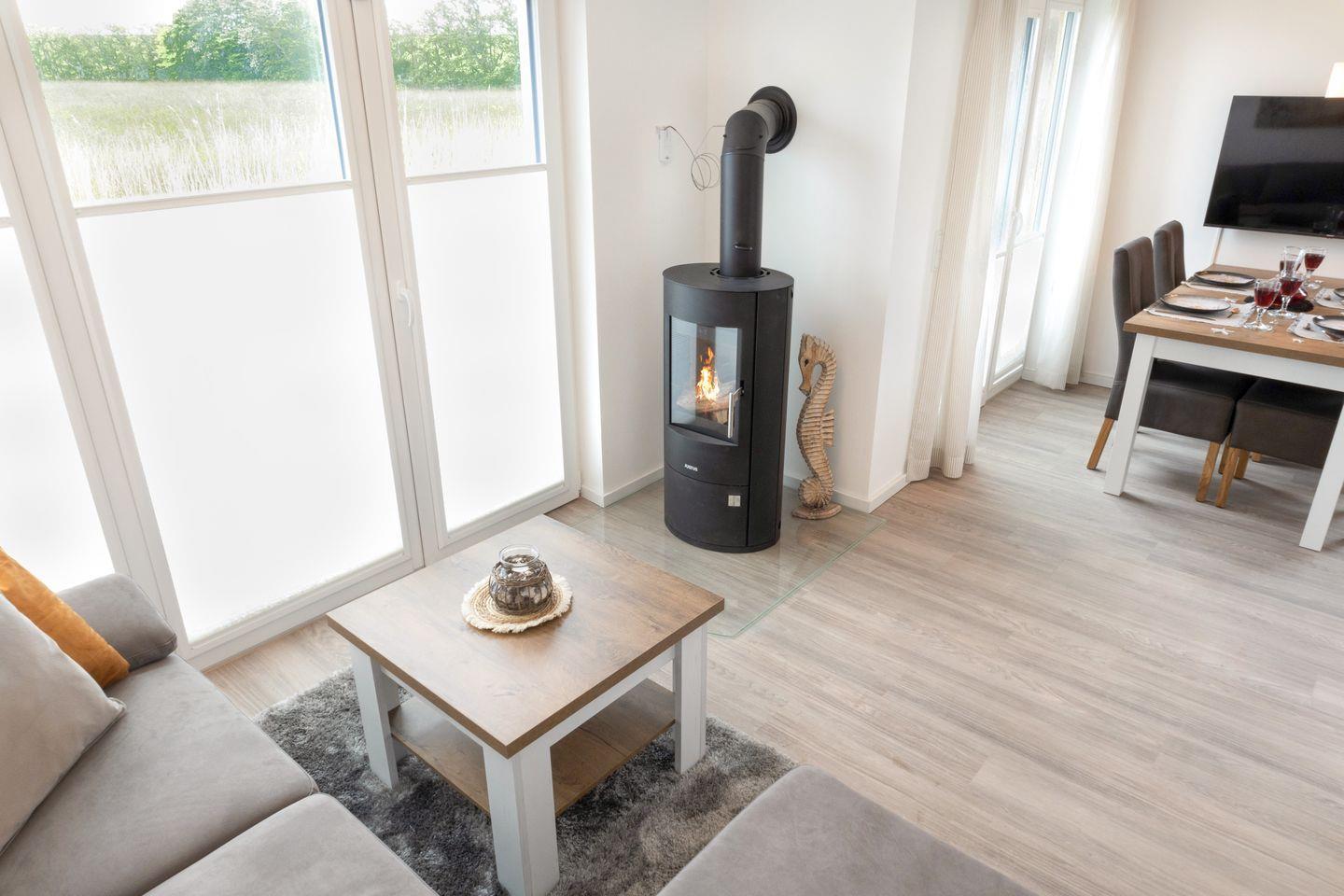 Im offenen Wohnbereich erwartet dich eine stilvolle Sitzecke mit Smart-TV (MagentaTV), ein Holzofenkamin für gemütliche Abende und der direkte Zugang zur Terrasse und zum Garten. Die moderne Küche ist komplett ausgestattet – perfekt für gemeinsame Kochmomente.