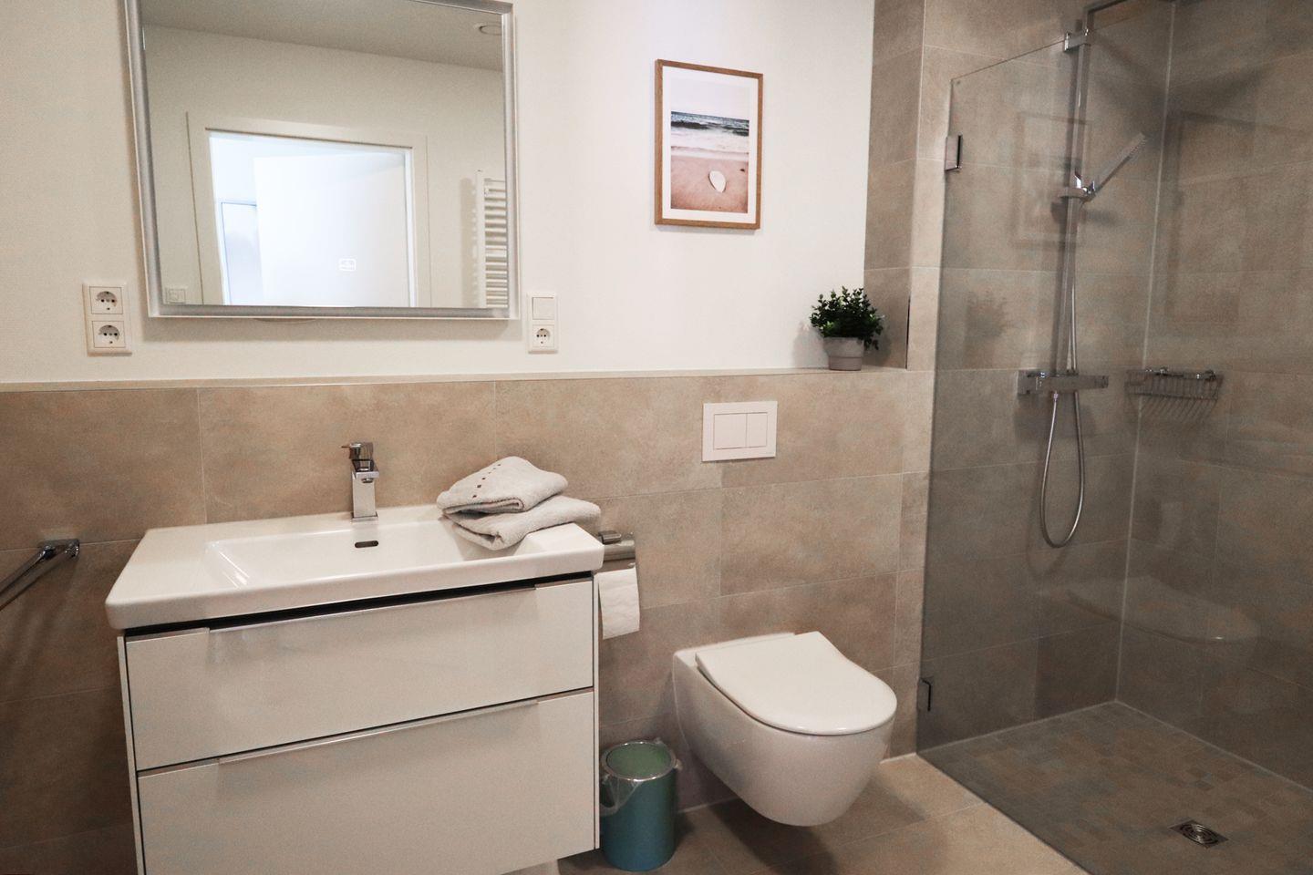 Ein besonderes Highlight ist die private Sauna in deiner Wohnung. Das moderne Bad verfügt außerdem über eine bodengleiche Dusche mit Wellness-Duschkopf – ideal für entspannte Stunden nach einem Tag an der frischen Nordseeluft.