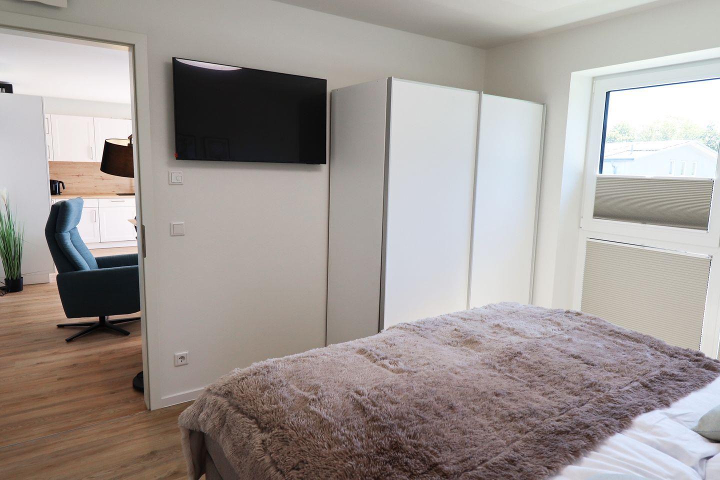 Zwei Schlafzimmer mit komfortablen Boxspringbetten (180x200 cm) sorgen für erholsamen Schlaf. In einem der Zimmer stehen dir ein Smart-TV sowie Verdunkelungsplissees zur Verfügung.
