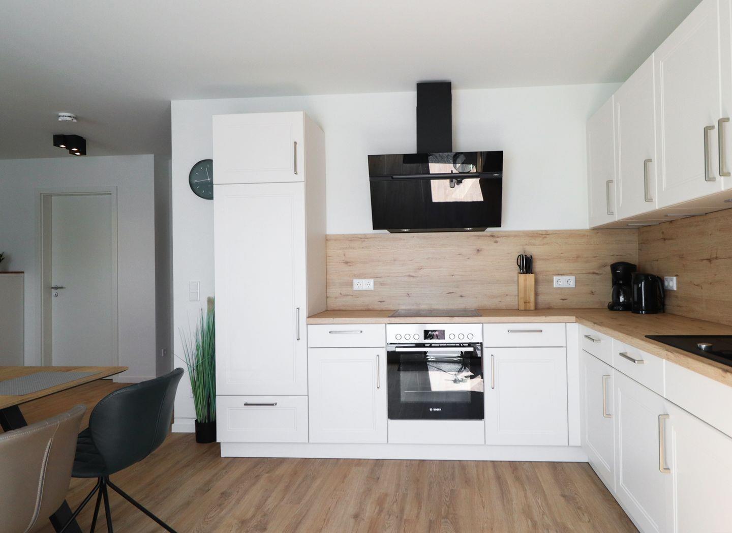 Der helle Wohnbereich mit bodentiefen Fenstern öffnet sich zum großzügigen Balkon. Ein gemütliches Sofa und ein Smart-TV laden zu entspannten Abenden ein. In der offenen Küche findest du alles für gemeinsame Mahlzeiten: Backofen, Herd, Geschirrspüler, Mikrowelle, Kühlschrank mit Gefrierfach, Kaffeemaschine, Wasserkocher und Toaster.
