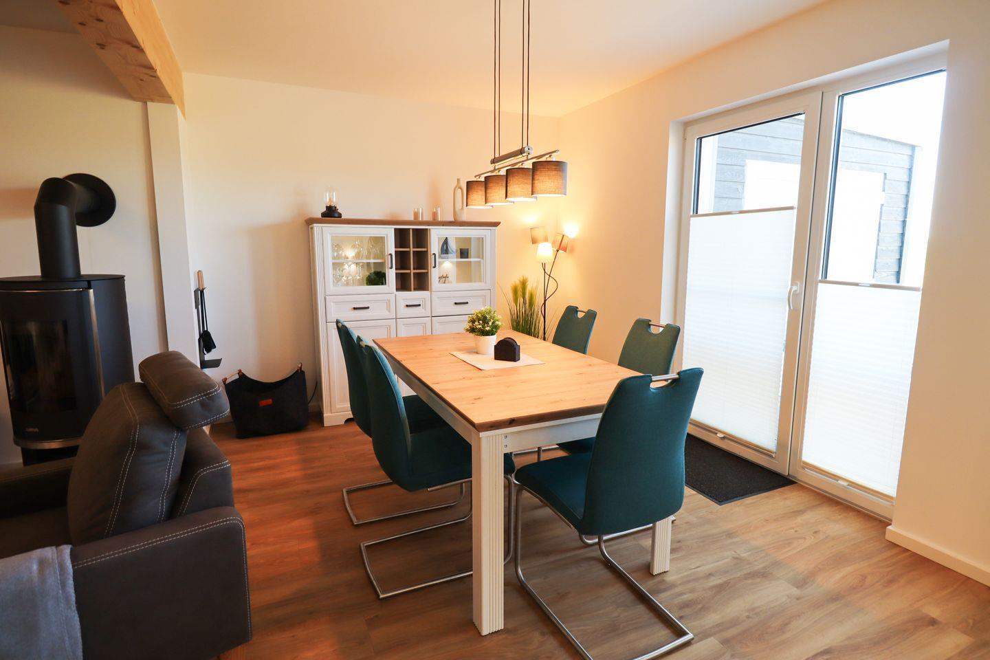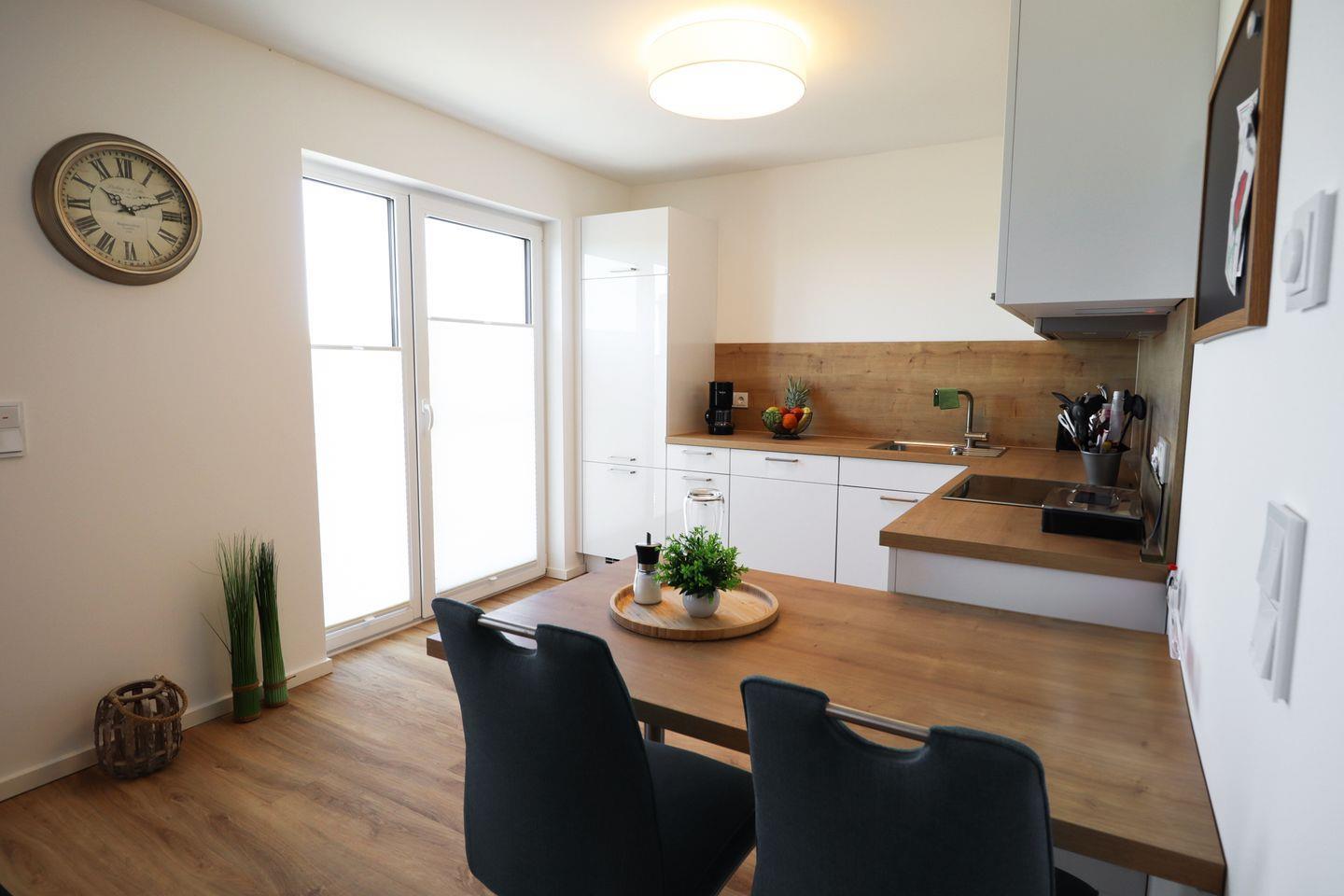 Der offene Wohnbereich mit Kamin und gemütlicher Sitzecke lädt zum Verweilen ein. Große Fenster lassen viel Licht herein und bieten einen traumhaften Blick ins Grüne. Die moderne Küche ist offen gestaltet und vollständig ausgestattet – ideal für entspannte Kochabende. Vom Wohnzimmer aus gelangt ihr direkt auf die geschützte Sonnenterrasse mit Zugang zum Garten.