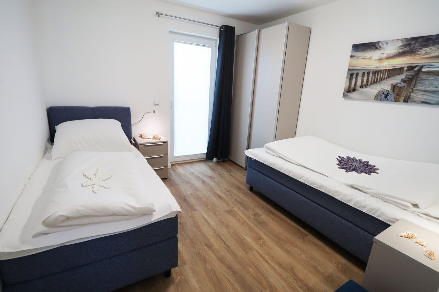 Das erste Schlafzimmer verfügt über ein Doppelbett (180?×?200?cm) und direkten Zugang zur Terrasse. Im zweiten Schlafzimmer stehen euch zwei hochwertige Einzelboxspringbetten (je 90?×?200?cm) zur Verfügung.