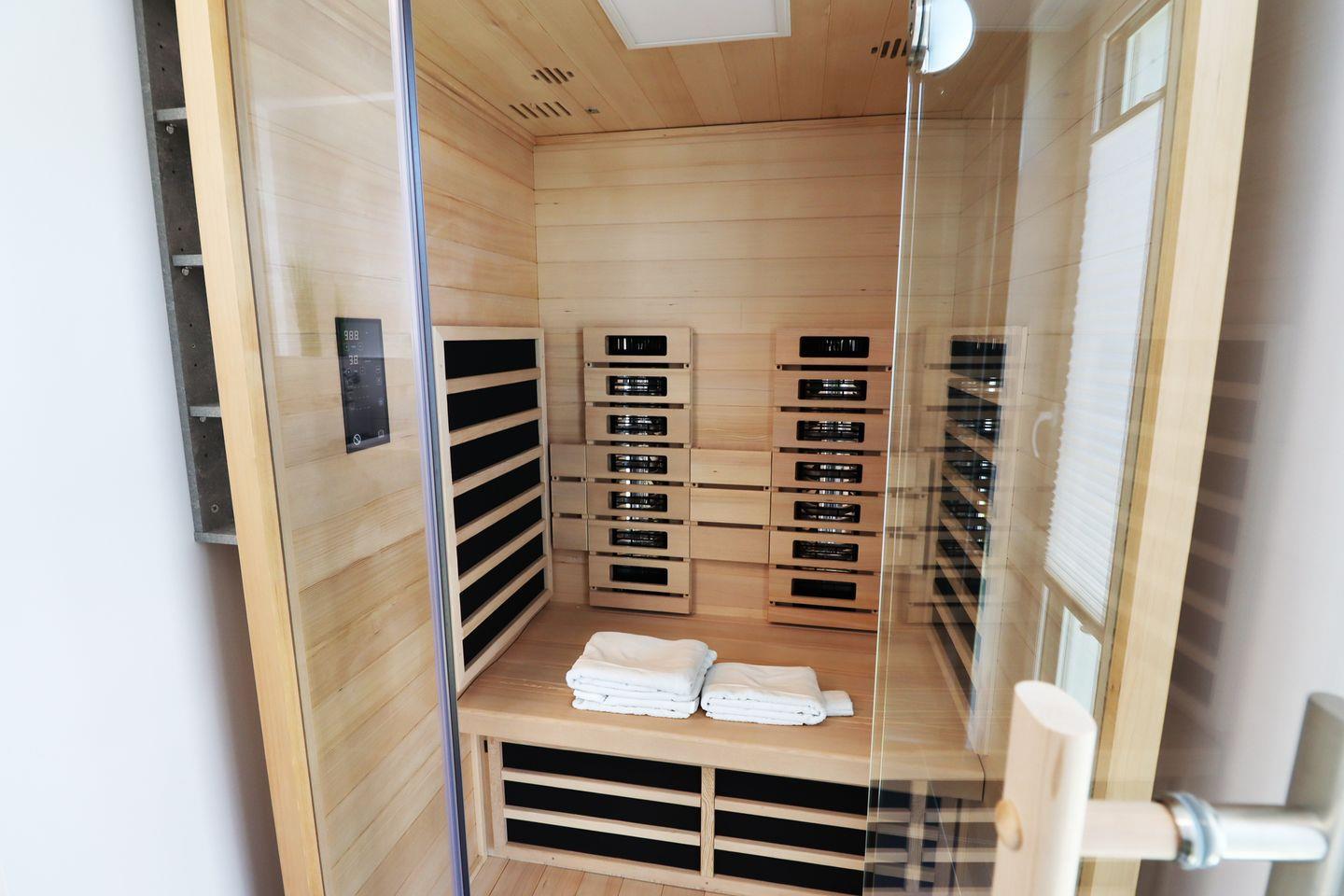 Euer privater Wellnessbereich erwartet euch mit einer Infrarotsauna und einer bodengleichen, großzügigen Dusche. Stilvolle Details und hochwertige Materialien sorgen für ein rundum wohltuendes Badeerlebnis.
