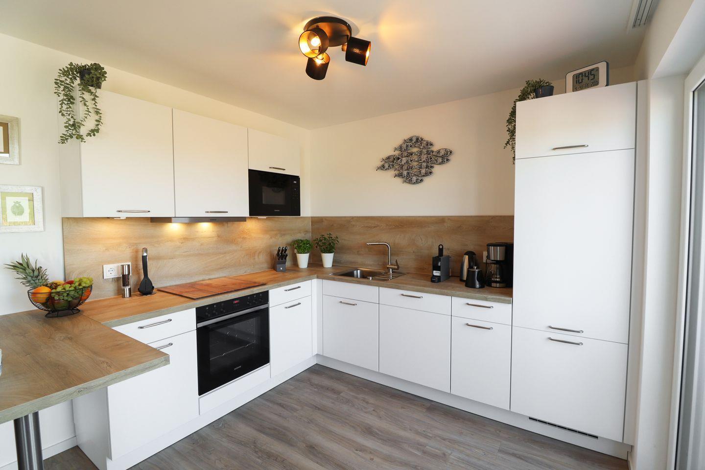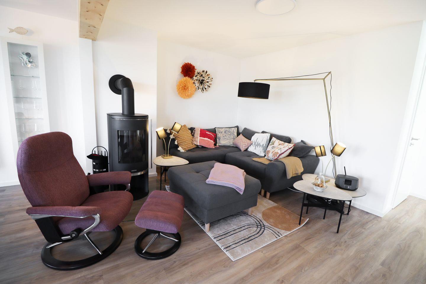 Der helle Wohnbereich bietet dir ein gemütliches Sofa, Smart-TV und einen hochwertigen Stressless-Sessel für entspanntes Sitzen. Der Holzofen sorgt für Wärme an kühleren Tagen. Durch bodentiefe Fenster gelangst du direkt auf die möblierte Terrasse mit Blick auf den Deich. Die offene Küche mit Theke ist komplett ausgestattet, inklusive Nespresso-Maschine, Mikrowelle und Geschirrspüler.