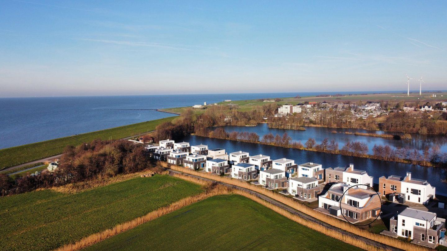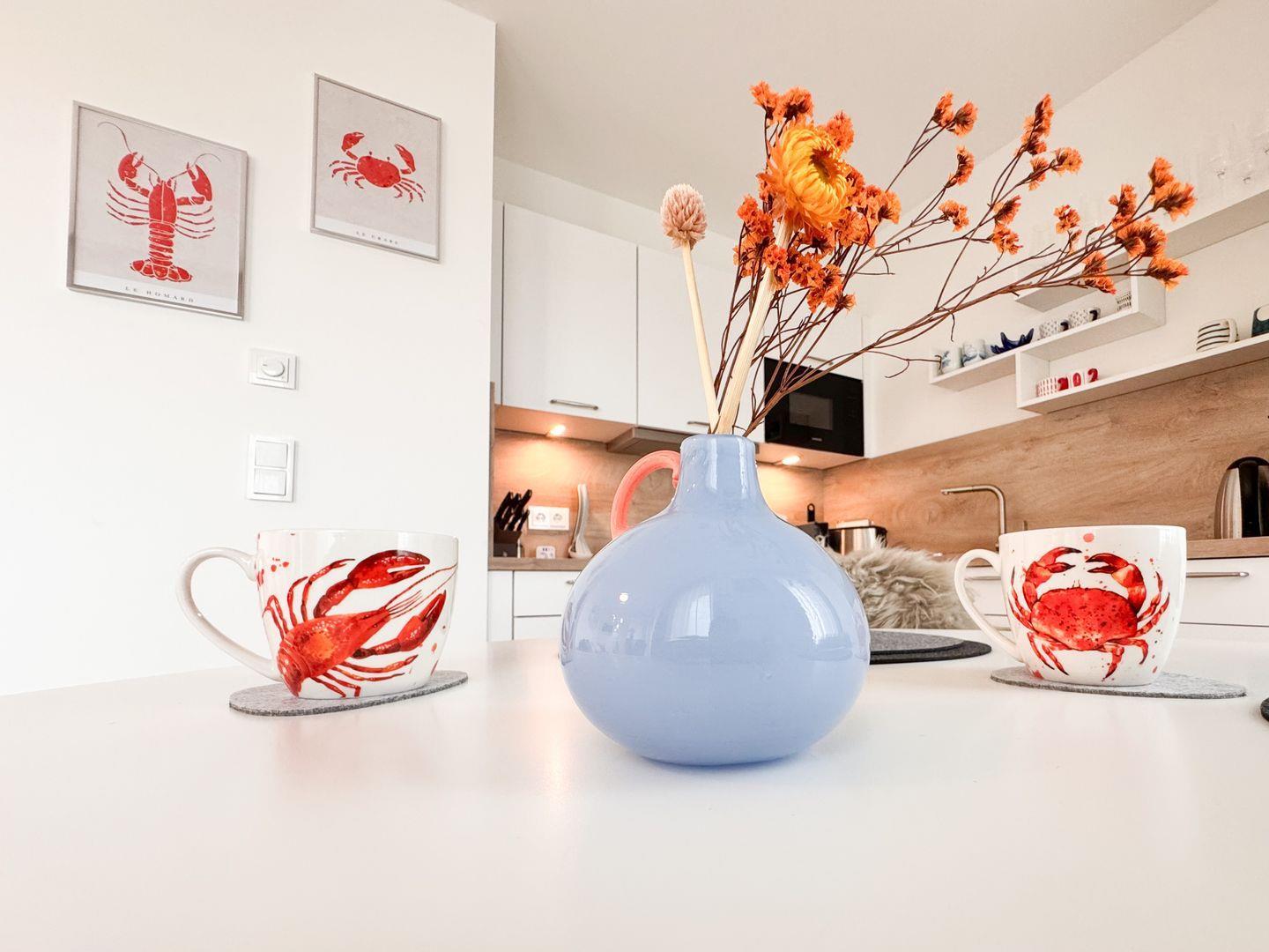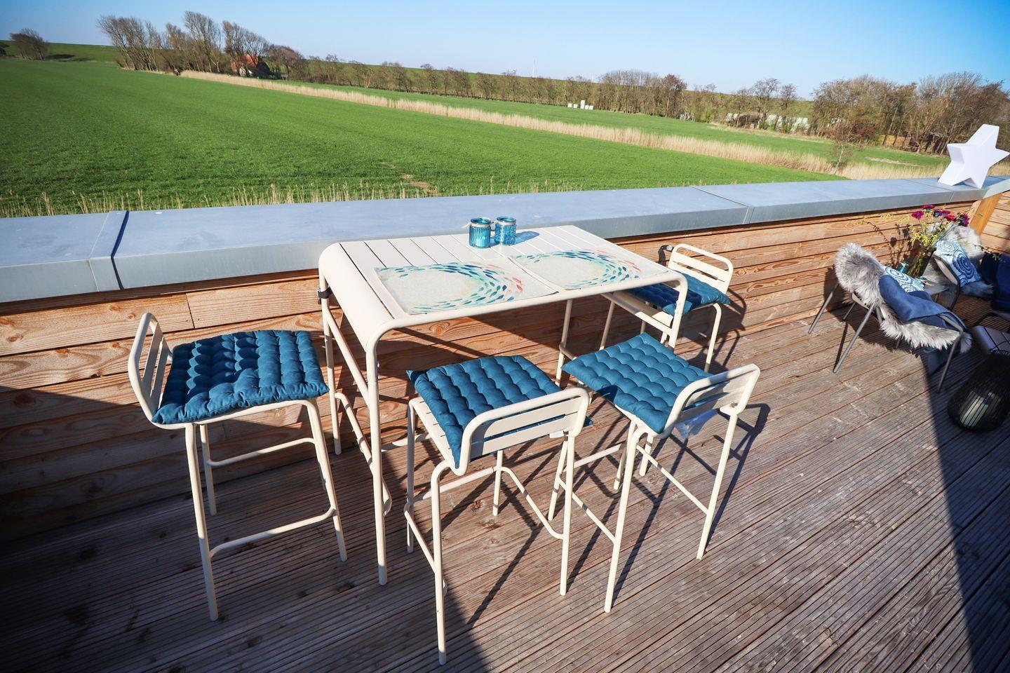 Der helle Wohnbereich ist modern und gemütlich eingerichtet. Smart-TV und ein Holzofen sorgen für entspannte Stunden. Durch die bodentiefen Fenster gelangst du auf die beiden Dachterrassen mit Blick ins Grüne und auf den Deich. Die offene Küche ist u. a. mit Nespresso-Maschine und Mikrowelle ausgestattet – perfekt für gemeinsame Kochmomente.