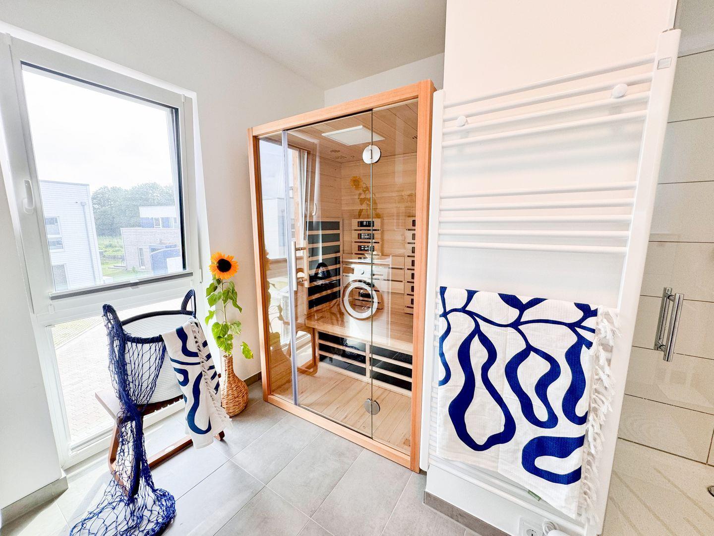 Im modernen Badezimmer findest du eine Infrarotsauna und eine bodengleiche Dusche – ideal für erholsame Wellnessmomente. Eine Waschmaschine steht dir ebenfalls zur Verfügung.