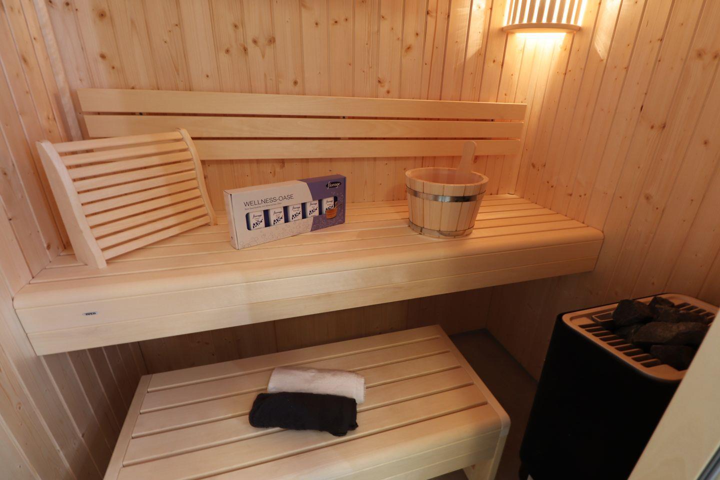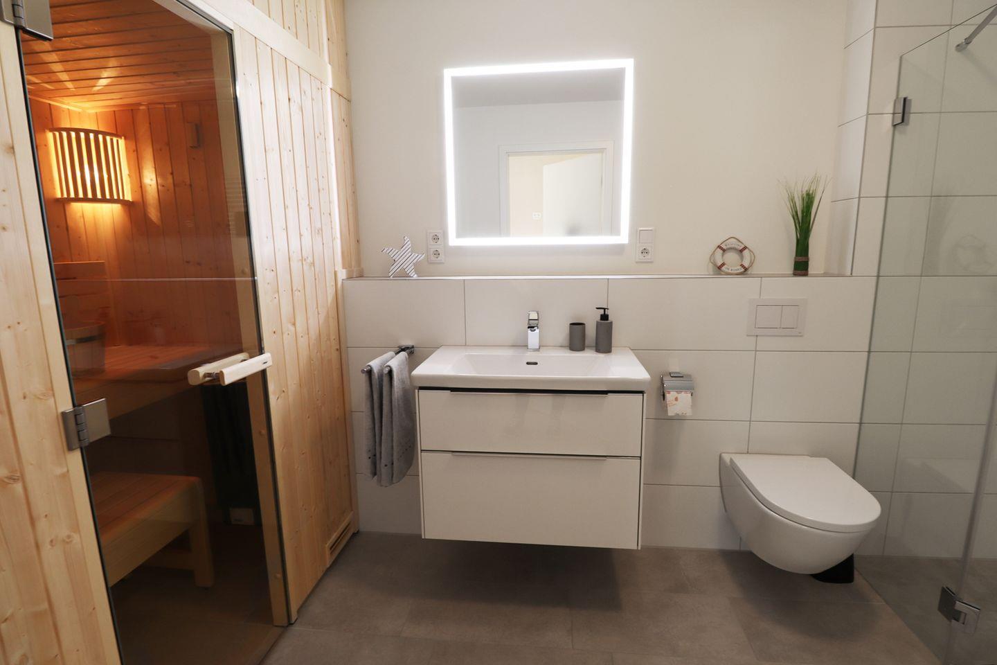 Das moderne Tageslichtbad verfügt über eine große Dusche, eine Sauna, Waschbecken, Spiegel und WC. Dank Fußbodenheizung ist es auch an kühlen Tagen angenehm warm.