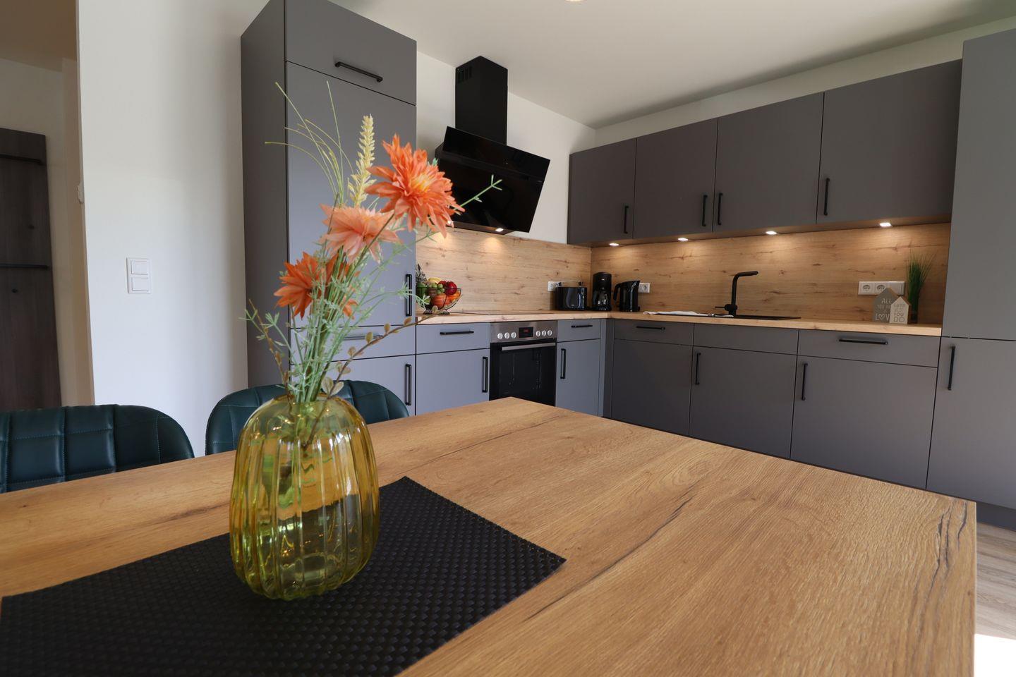 Der offene Wohnbereich ist gemütlich und stilvoll eingerichtet. Auf dem großen Sofa kannst du es dir mit einem Buch bequem machen oder den Smart-TV genießen. Der angrenzende Essbereich lädt zum gemeinsamen Frühstück oder Spieleabend ein. Vom Wohnzimmer aus gelangst du direkt auf den sonnigen Balkon mit Blick ins Grüne.