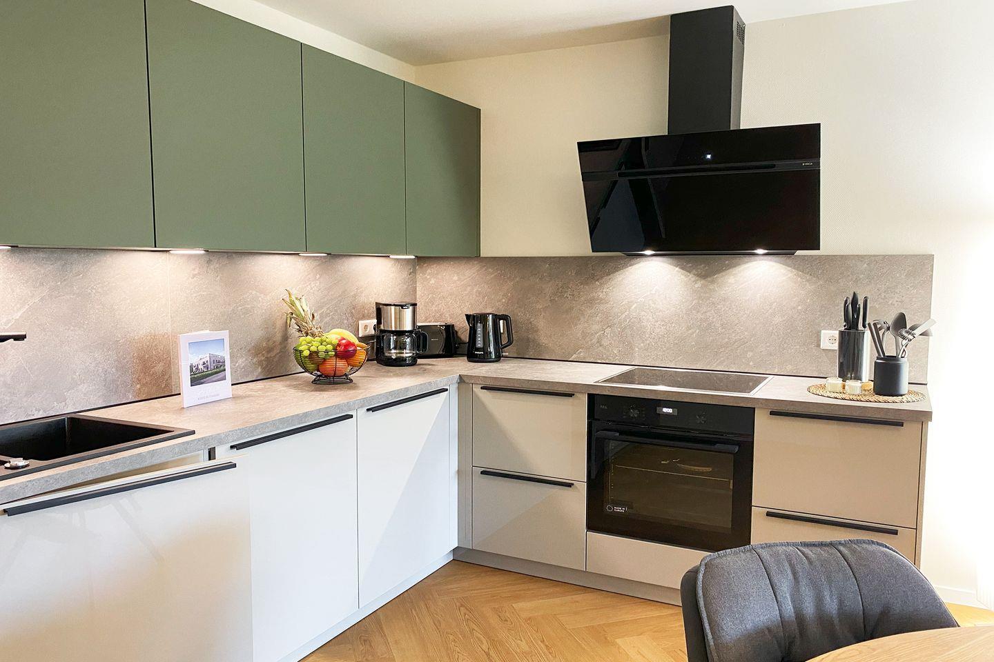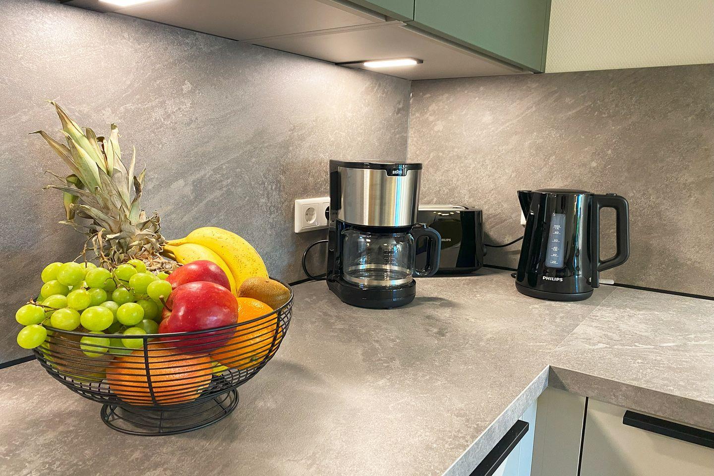 Der offene Wohnbereich mit direktem Zugang zur Terrasse lädt zum Verweilen ein. Große Fenster lassen viel Tageslicht herein und schaffen eine freundliche Atmosphäre. Die voll ausgestattete Küche bietet alles für gemeinsame Kochabende – inklusive Raclette-Grill für gemütliche Stunden. Im Wohnbereich steht ein hochwertiges Schrankbett für zwei Gäste bereit. Smart-TV, Bücher und Spiele sorgen für beste Unterhaltung.