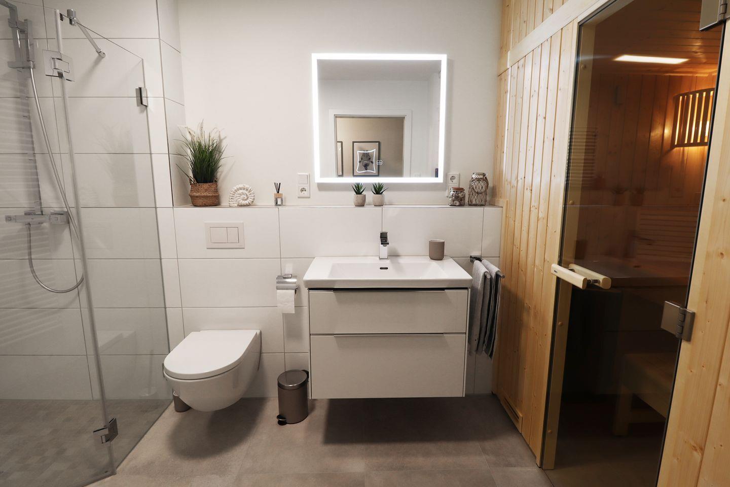 Genieße deine Auszeit im modernen Badezimmer mit bodentiefer Dusche und eigener Sauna – perfekt, um nach einem aktiven Tag am Deich zur Ruhe zu kommen.