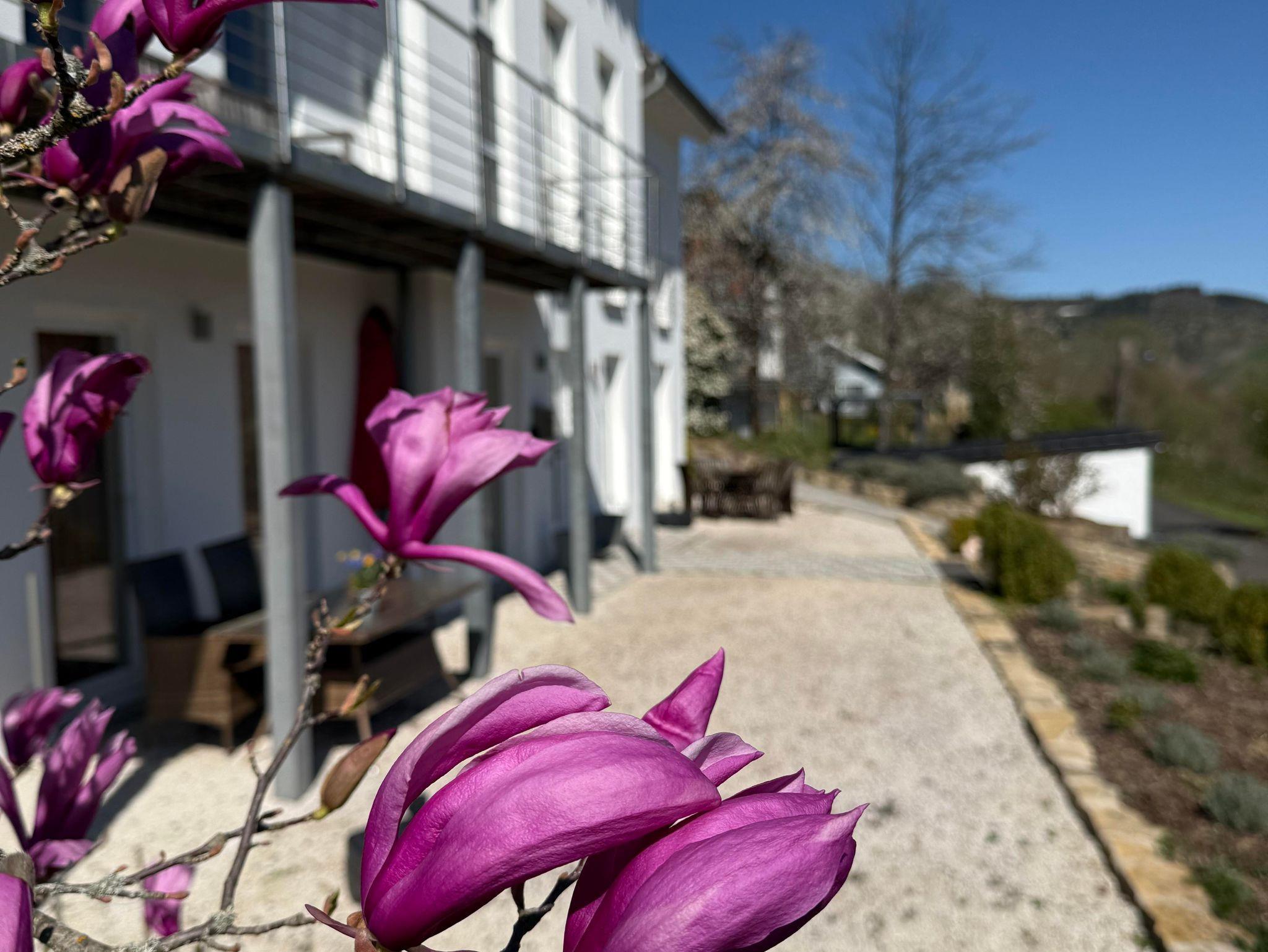 Schöne Aussicht von der eigenen Terrasse mit Gartenmöbeln (Sonnenschirm vorhanden).