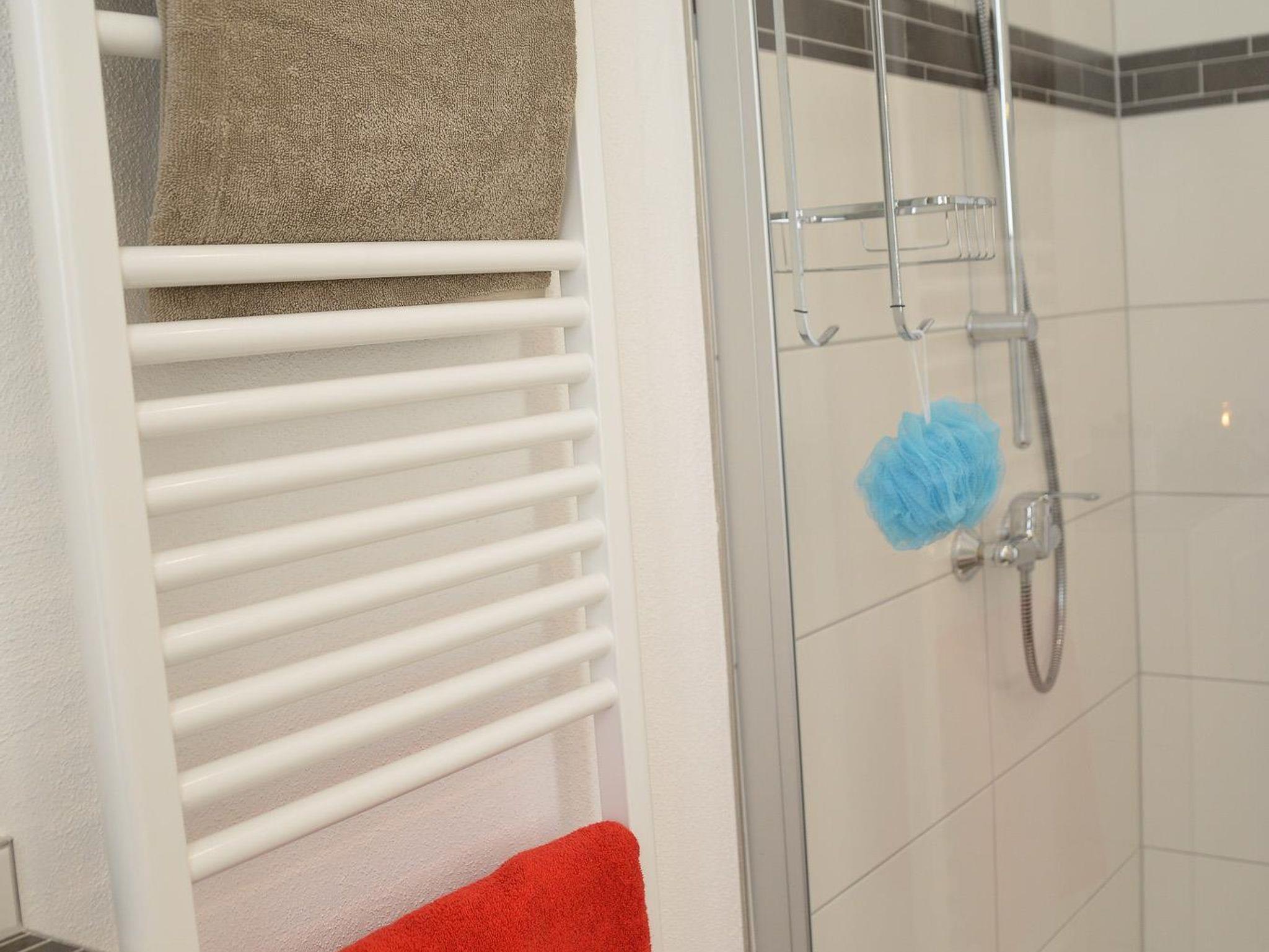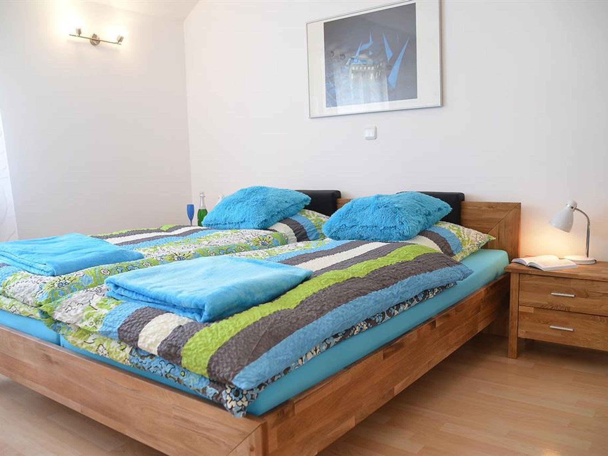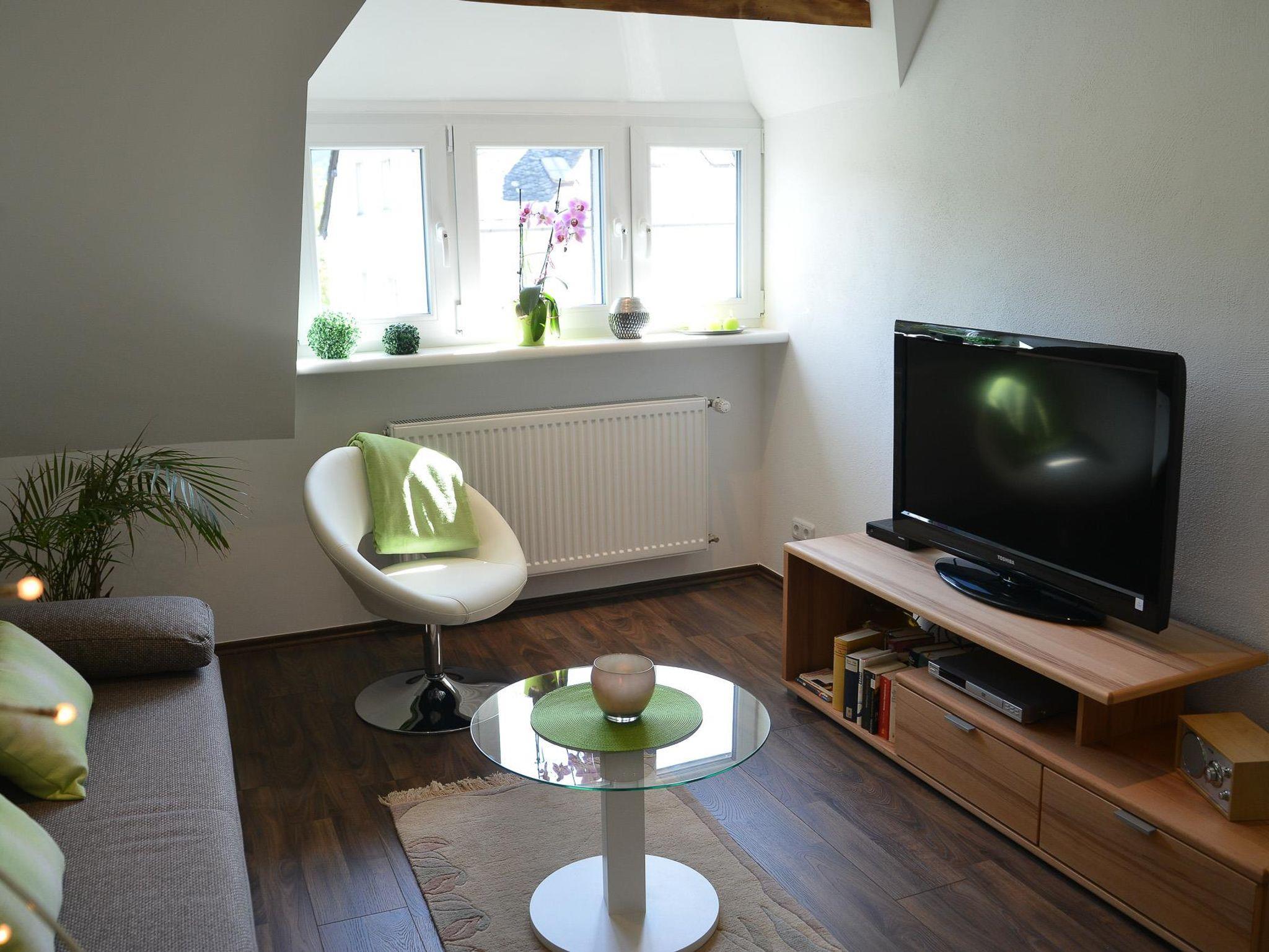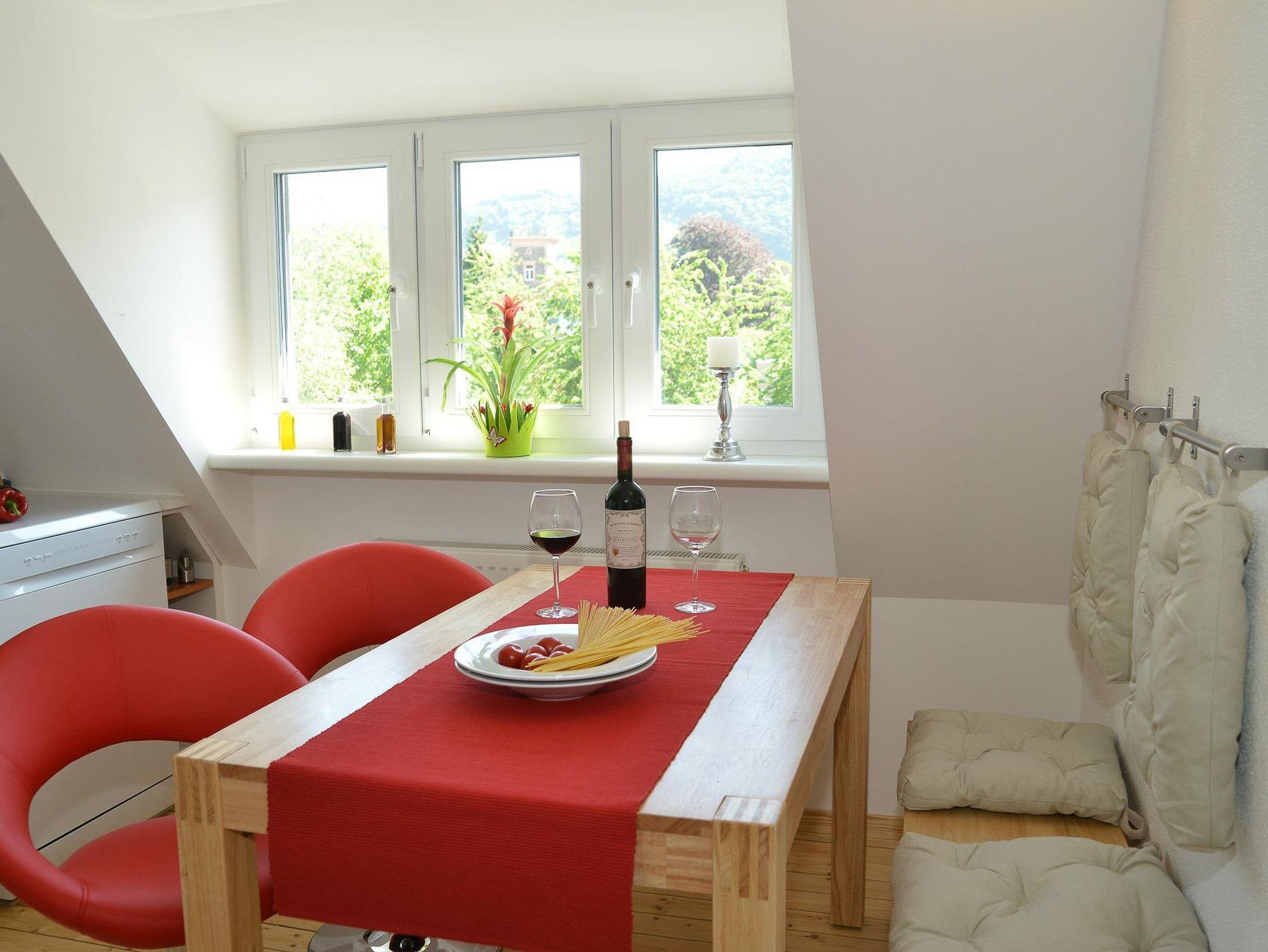 Die Wohnung im Dachgeschoss ( Appartement 2) verfügt über ein Schlafzimmer mit großem Doppelbett, ein Wohnzimmer, ein modernes Duschbad und eine Küche mit gemütlichem Essplatz.