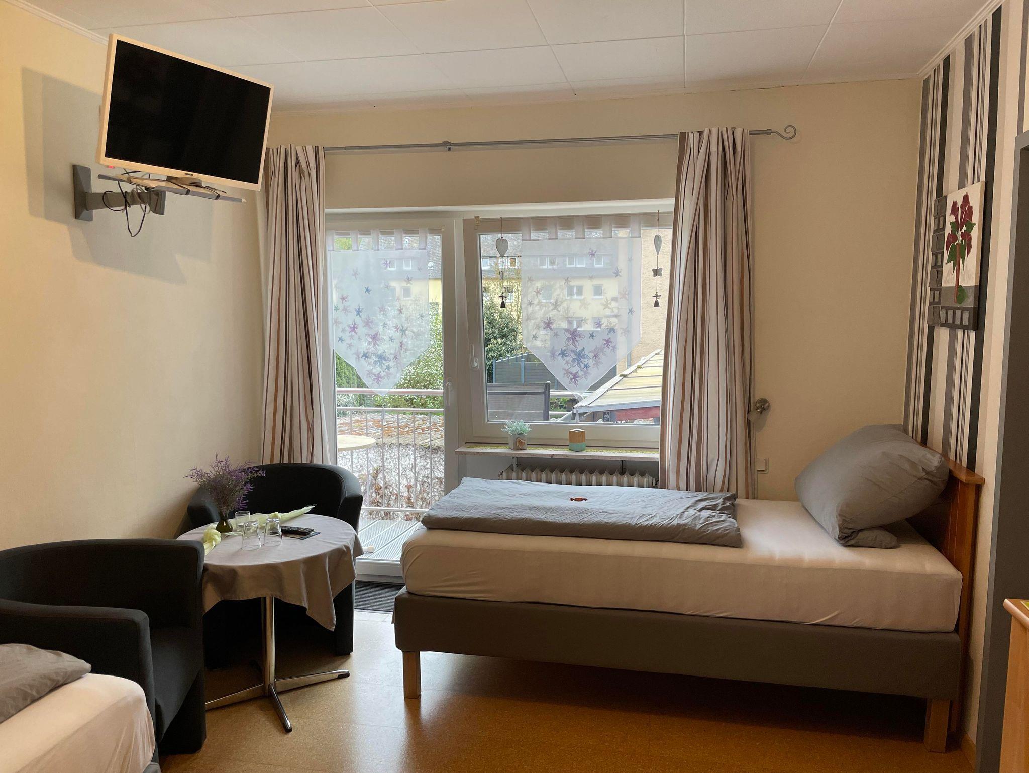 ruhiges, helles Zimmer mit getrennt stehenden Betten, Balkon, Sitzecke, SAT-TV