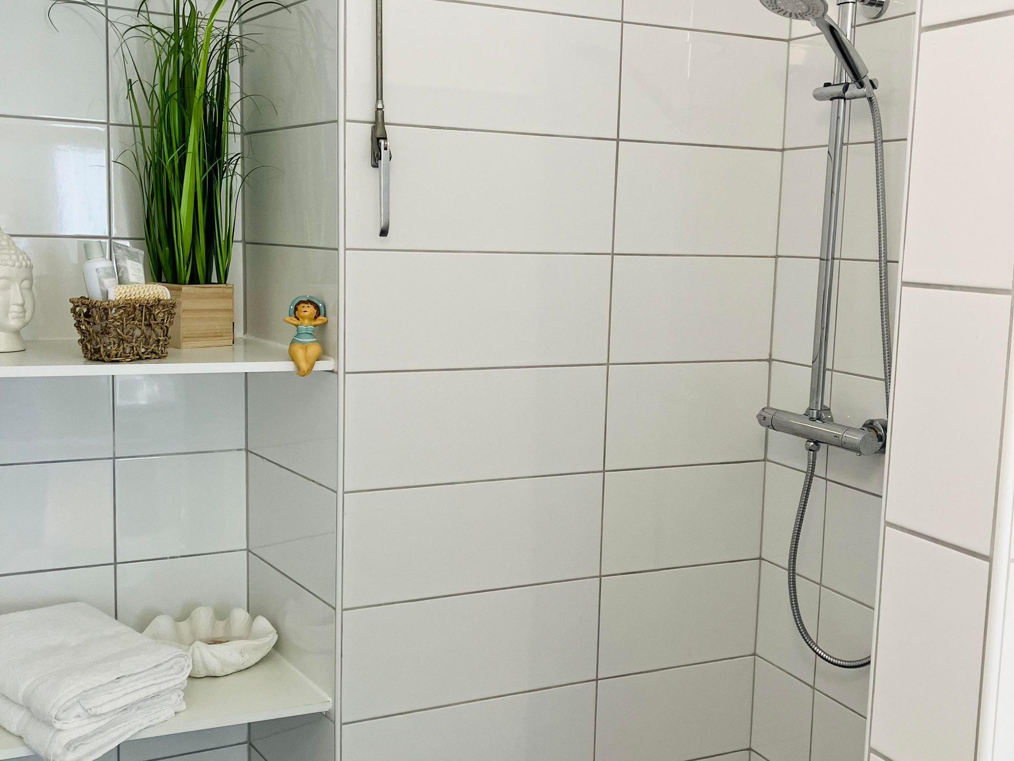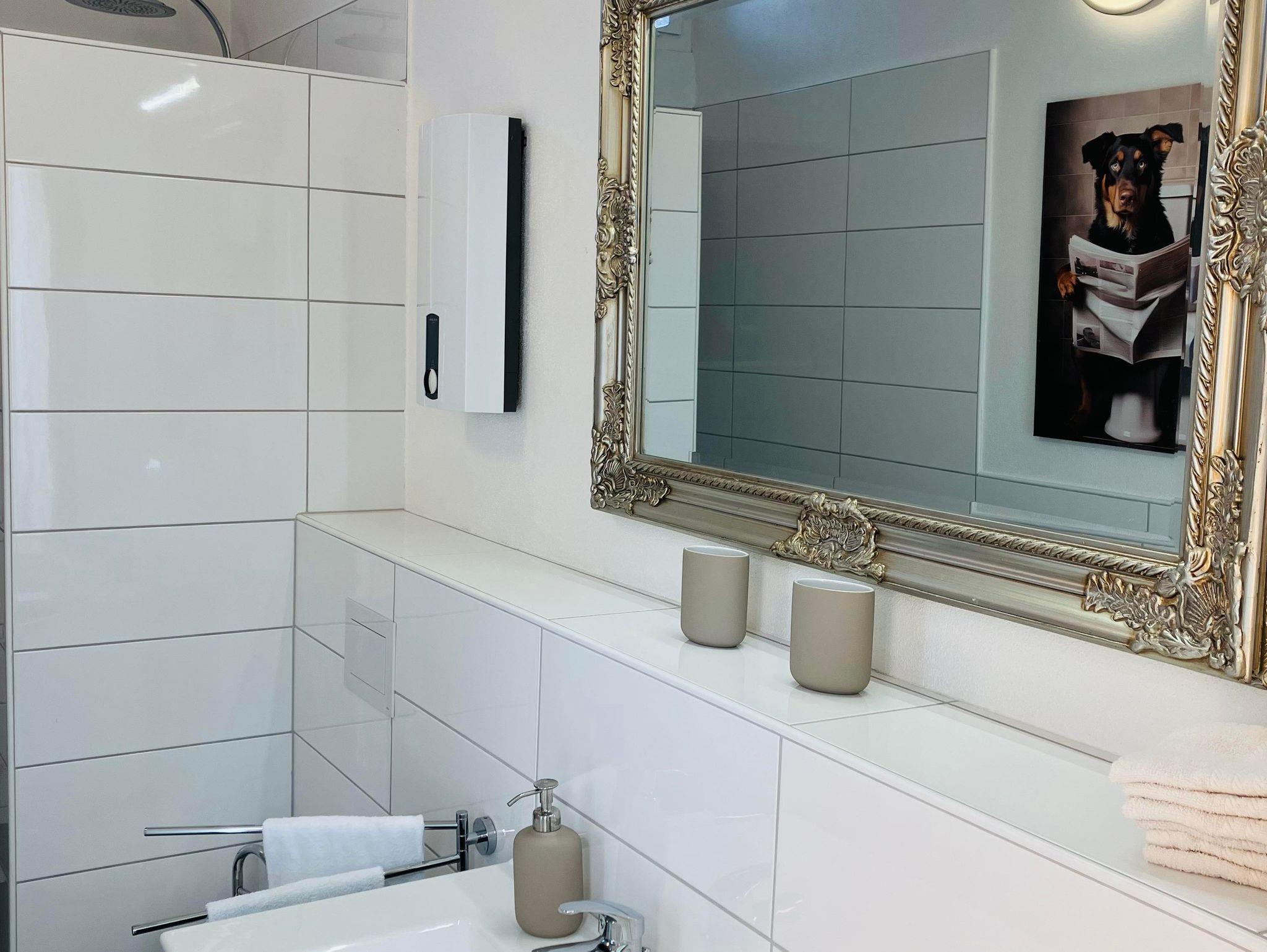 In den modernen Duschbädern werden Handtücher zur Verfügung gestellt. Die Wohnzimmer verfügen über Smart-TV-Geräte und gemütlichen Sofas.