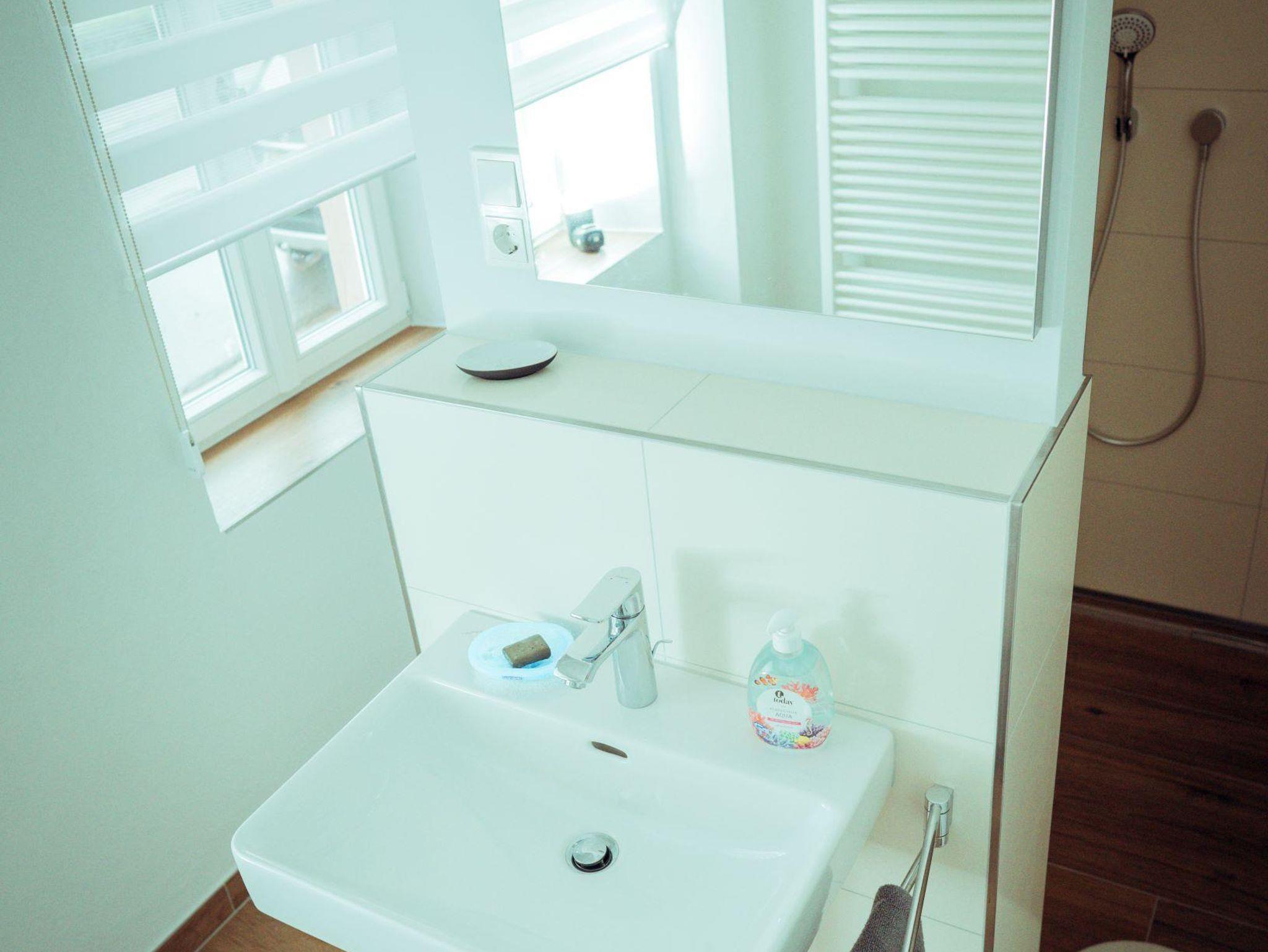 Privater Stellplatz für Autos und Garage für Fahrräder. Separate Terrasse im EG und OG. Wellness mit Sauna, Relax-Dusche, Fußbad und Liegen. Waschmaschine und Trockner zur gemeinsamen Nutzung im Flur des Erdgeschosses, ebenso ein kleiner Infodesk mit ausführlichen Informationen für Ihren Aufenthalt.