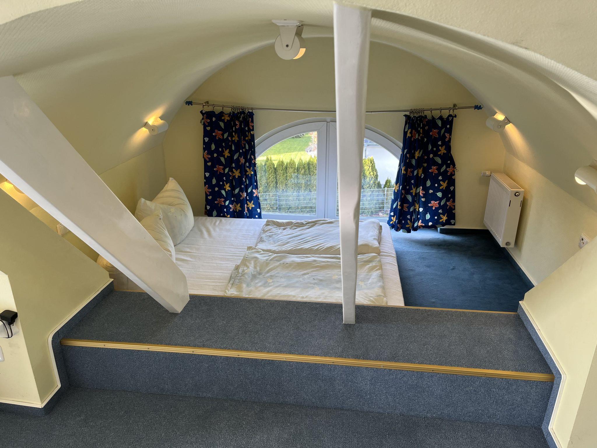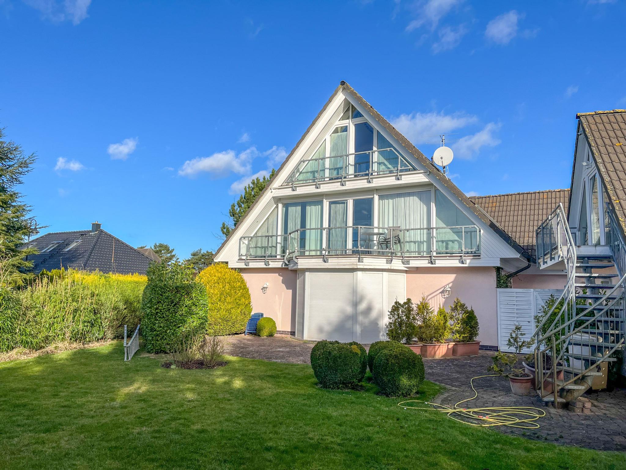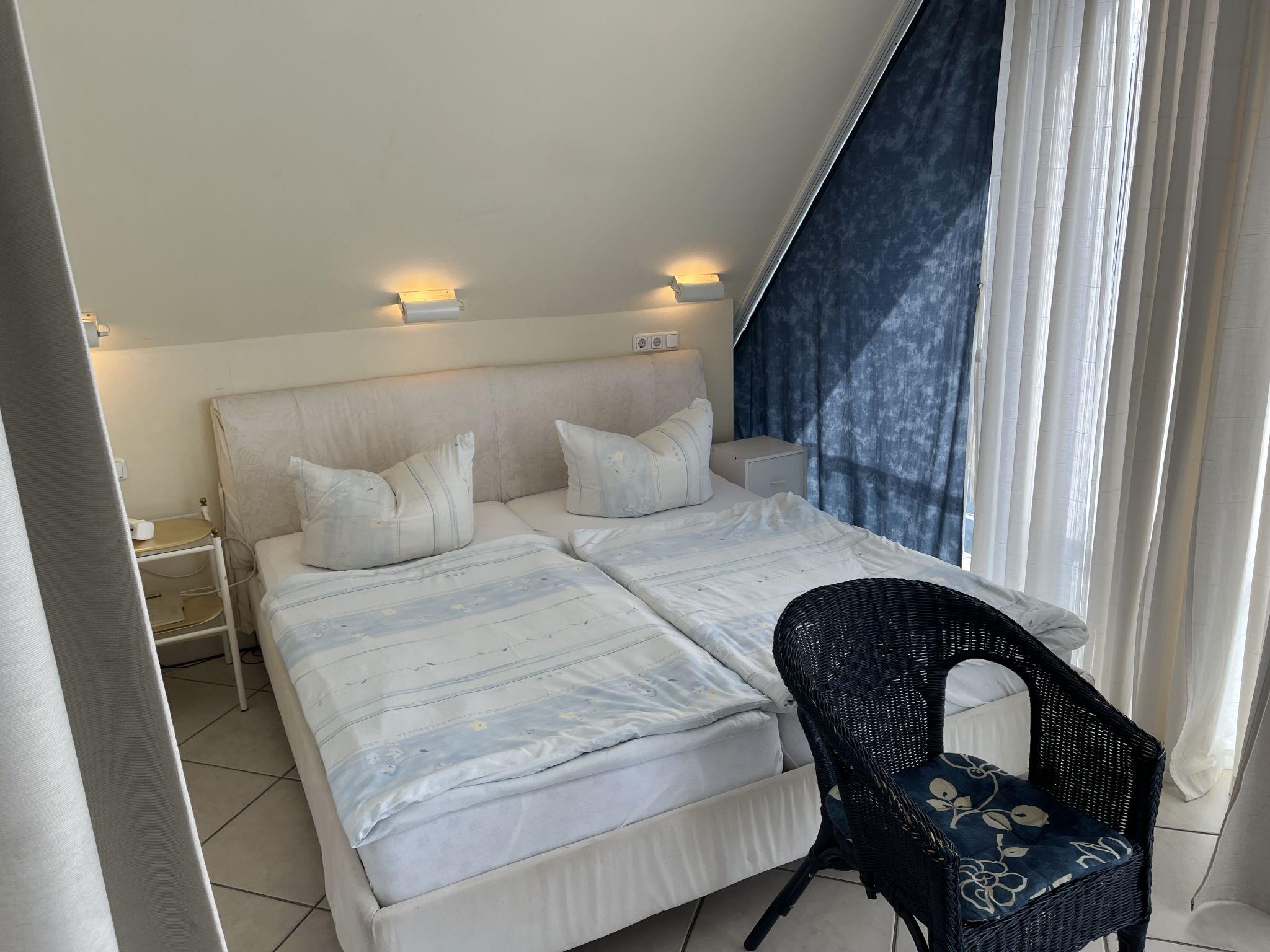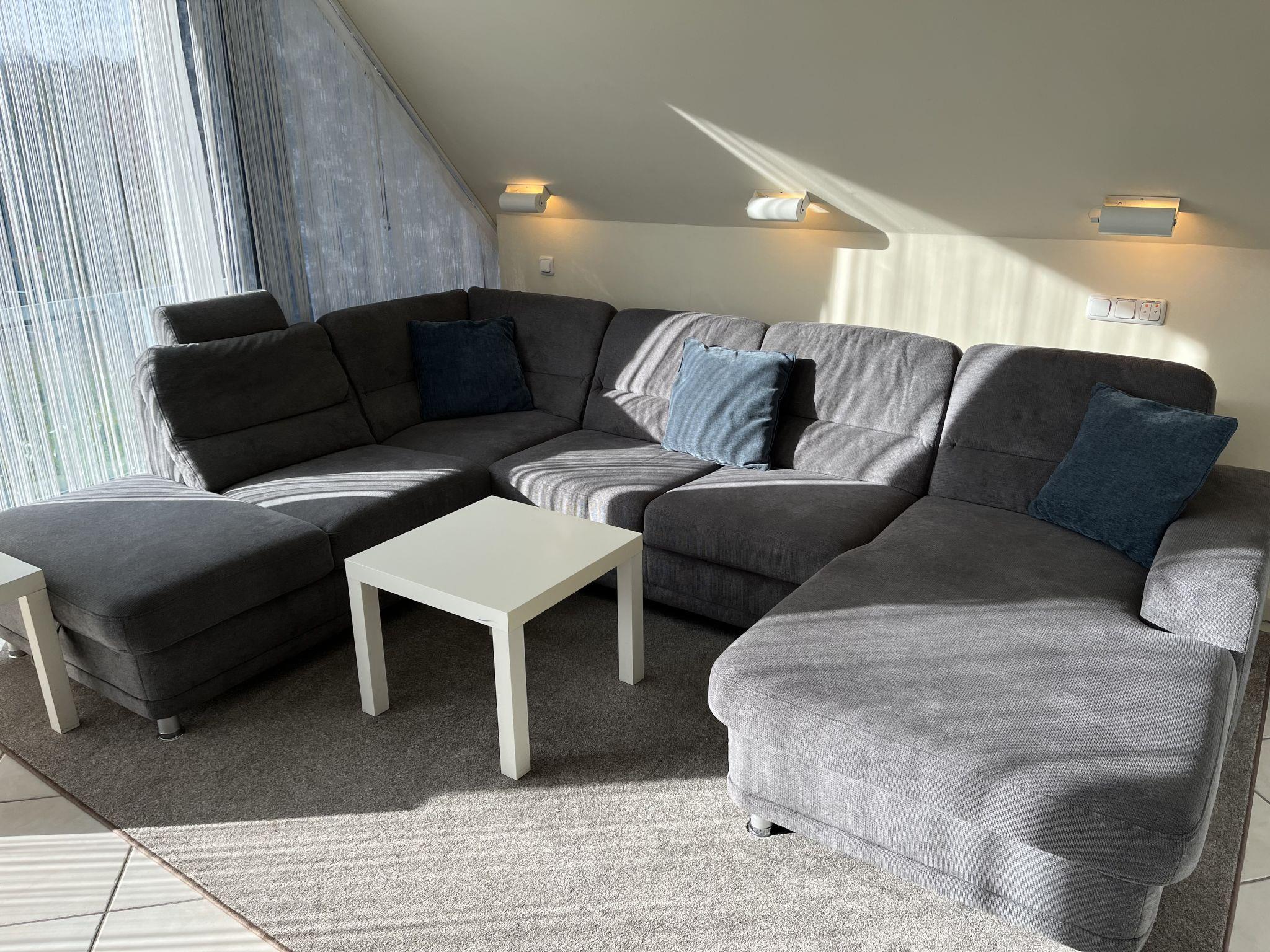 "Eike", 5-room apartment 150 m2 on 2 levels on 1st floor. Practical furnishings: living/sleeping room with sloping ceilings with 1 double bed, dining table, satellite TV, radio and CD-player. Exit to the balcony. Living/dining room with sloping ceilings with 1 double bed, dining nook, kitchen corner, satellite TV and hi-fi system. Exit to the balcony. 1 room with sloping ceilings with 1 double bed and satellite TV. 1 room with sloping ceilings with 2 sofabeds and satellite TV. Kitchenette (2 hot plates, dishwasher, toaster, kettle, microwave, electric coffee machine). 2 baths/WC. Top floor: living room with sloping ceilings with satellite TV. Open alcove with 2 sleeping facilities. Kitchenette (2 hot plates, dishwasher, toaster, kettle, microwave, electric coffee machine). Shower/WC. Gas heating. Carpet. Balcony. Balcony furniture. Facilities: children's high chair, baby cot. Internet (WiFi, free). Parking (3 cars) at the house. Please note: non-smokers only. Smoke alarm. No internal connecting door between the separated properties. Please note: This apartment consists of a total of 3 independent living units. Instead of an enclosed bedroom, some sleeping areas are located in an open-plan area (gallery, alcove, etc.).
