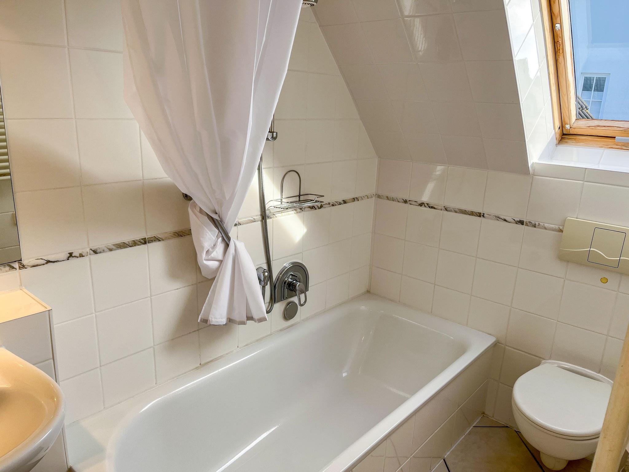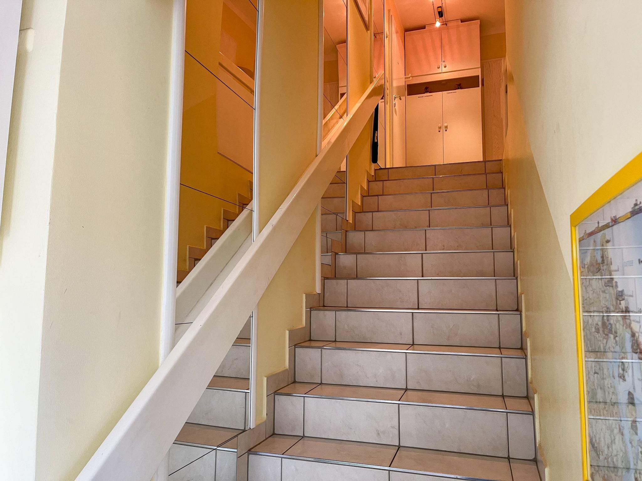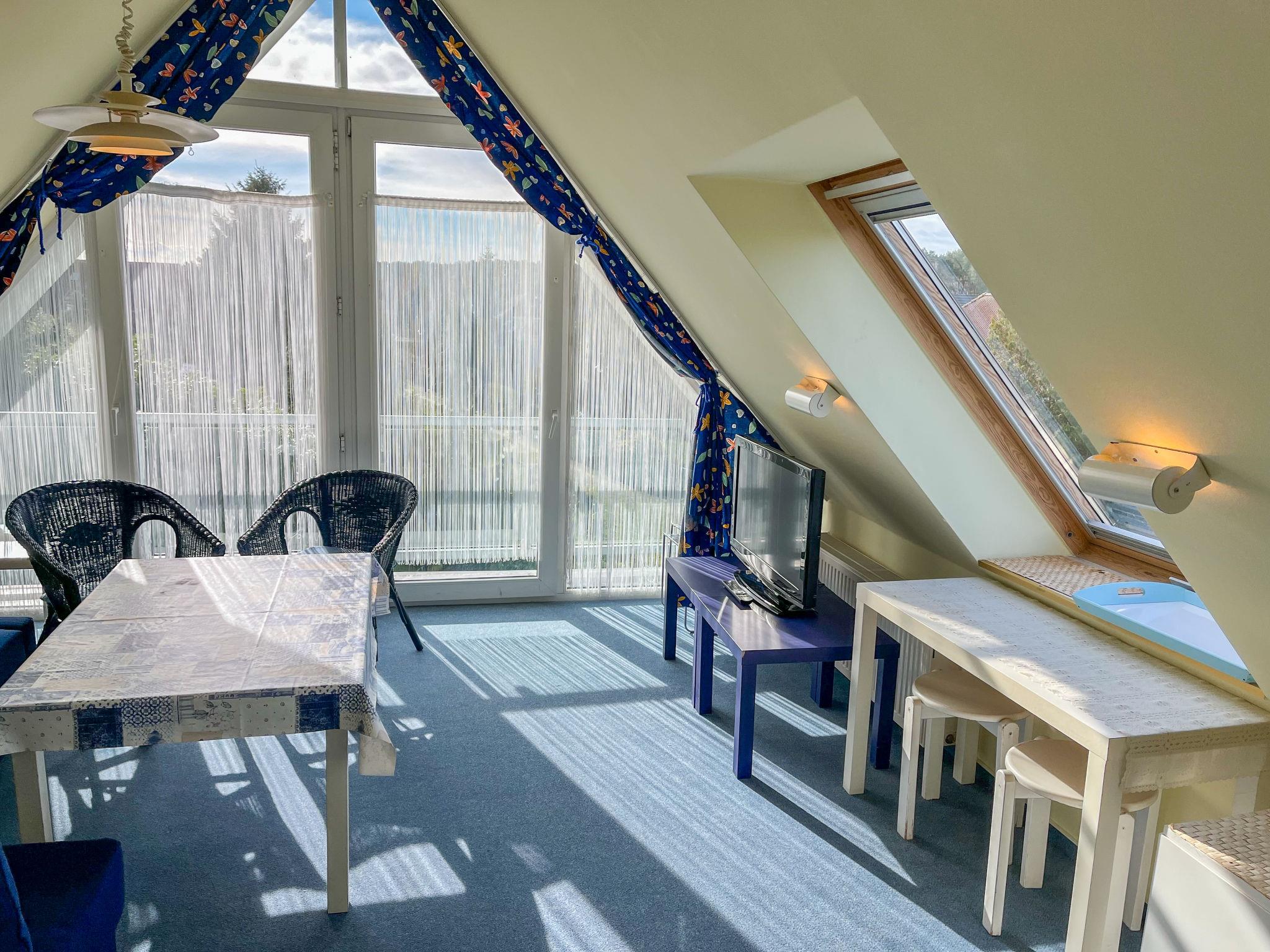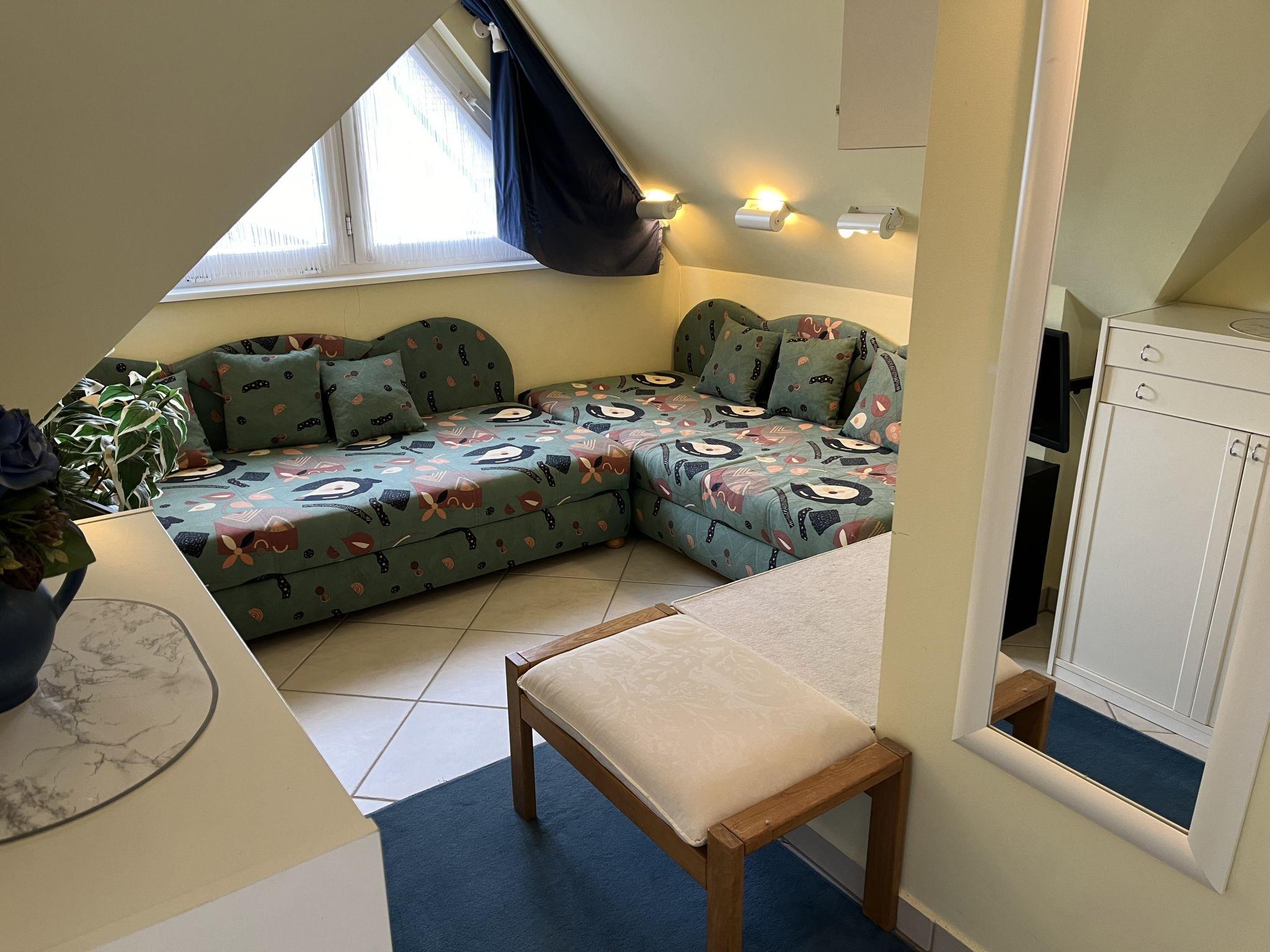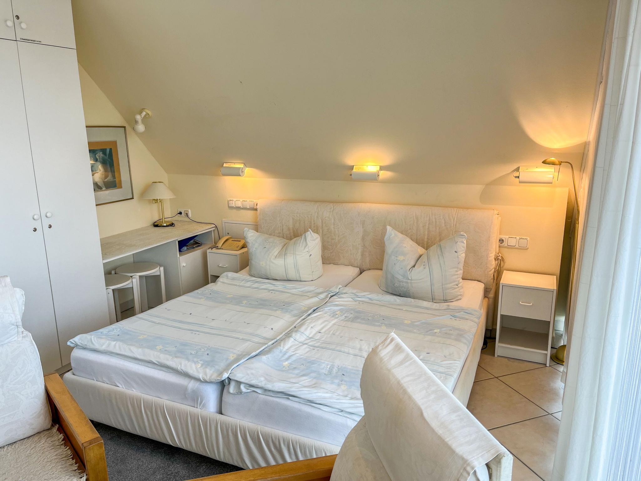 "Eike", 5-room apartment 150 m2 on 2 levels on 1st floor. Practical furnishings: living/sleeping room with sloping ceilings with 1 double bed, dining table, satellite TV, radio and CD-player. Exit to the balcony. Living/dining room with sloping ceilings with 1 double bed, dining nook, kitchen corner, satellite TV and hi-fi system. Exit to the balcony. 1 room with sloping ceilings with 1 double bed and satellite TV. 1 room with sloping ceilings with 2 sofabeds and satellite TV. Kitchenette (2 hot plates, dishwasher, toaster, kettle, microwave, electric coffee machine). 2 baths/WC. Top floor: living room with sloping ceilings with satellite TV. Open alcove with 2 sleeping facilities. Kitchenette (2 hot plates, dishwasher, toaster, kettle, microwave, electric coffee machine). Shower/WC. Gas heating. Carpet. Balcony. Balcony furniture. Facilities: children's high chair, baby cot. Internet (WiFi, free). Parking (3 cars) at the house. Please note: non-smokers only. Smoke alarm. No internal connecting door between the separated properties. Please note: This apartment consists of a total of 3 independent living units. Instead of an enclosed bedroom, some sleeping areas are located in an open-plan area (gallery, alcove, etc.).