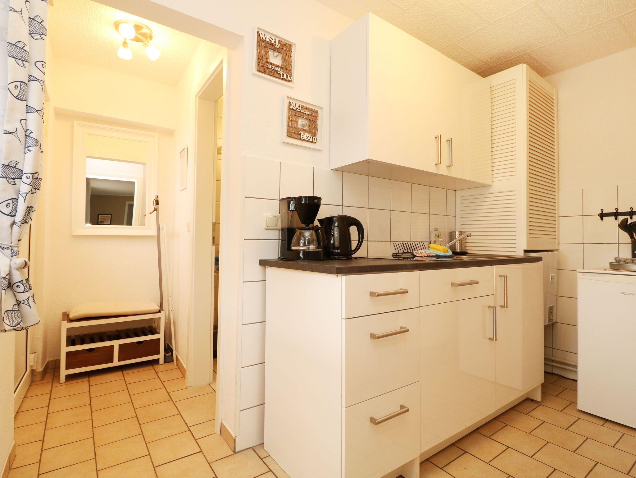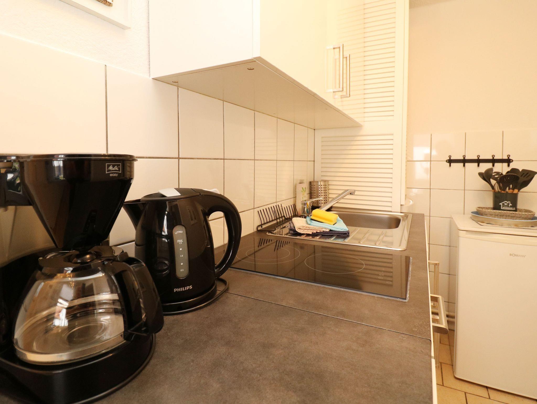 einem Kühlschrank mit Gefriermöglichkeit und einer kompletten Küchenausstattung. Dazu gehören auch Kaffeemaschine, Wasserkocher und Toaster.