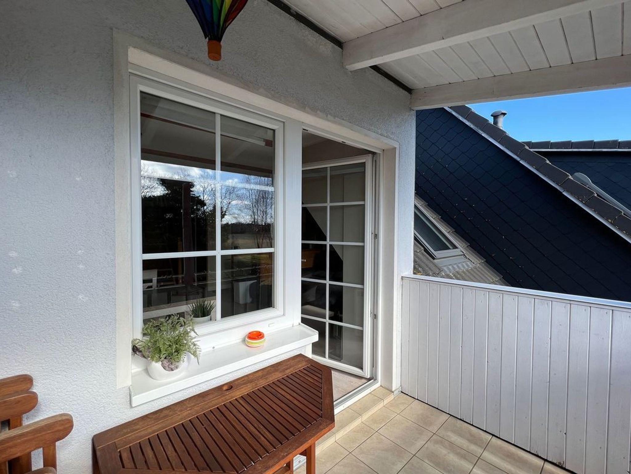 Vom Wohnnereich aus gelangen Sie auf den überdachten Balkon in Südlage, auf dem Sie den Urlaubstag in Ruhe und mit Blick in die Natur genießen können.