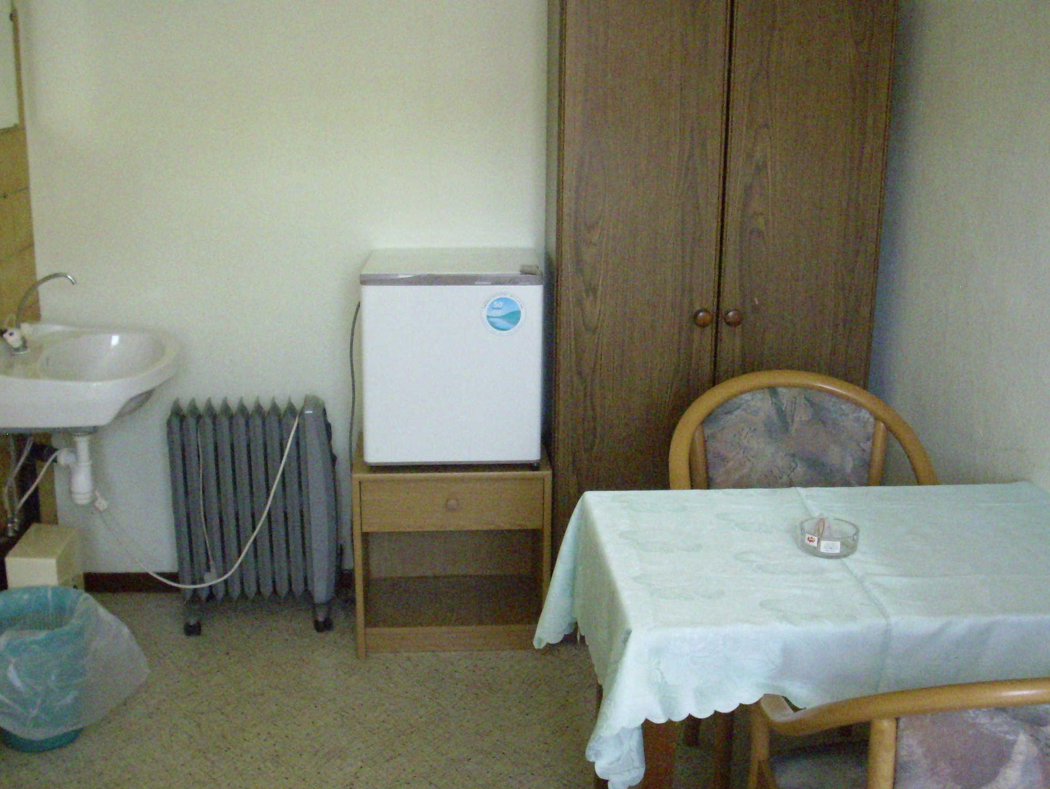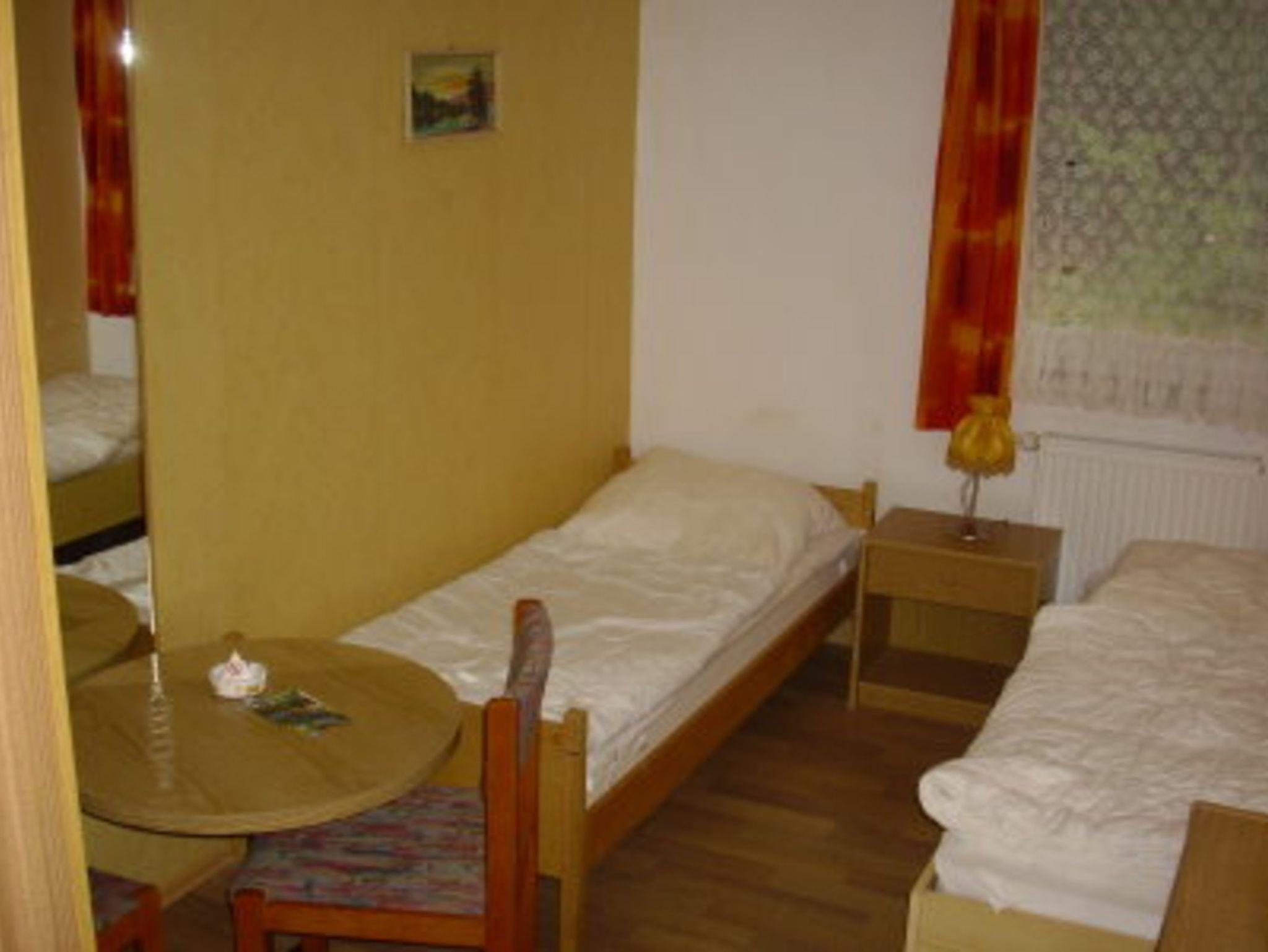 Schmales, einfach möbliertes Zweibettzimmer mit zwei durch Nachtschrank getrennten Einzelbetten, mit Kleiderschrank, Tisch und 2 Stühlen, Größe ca. 10 m², Fernheizung und TV befinden sich auch im Zimmer