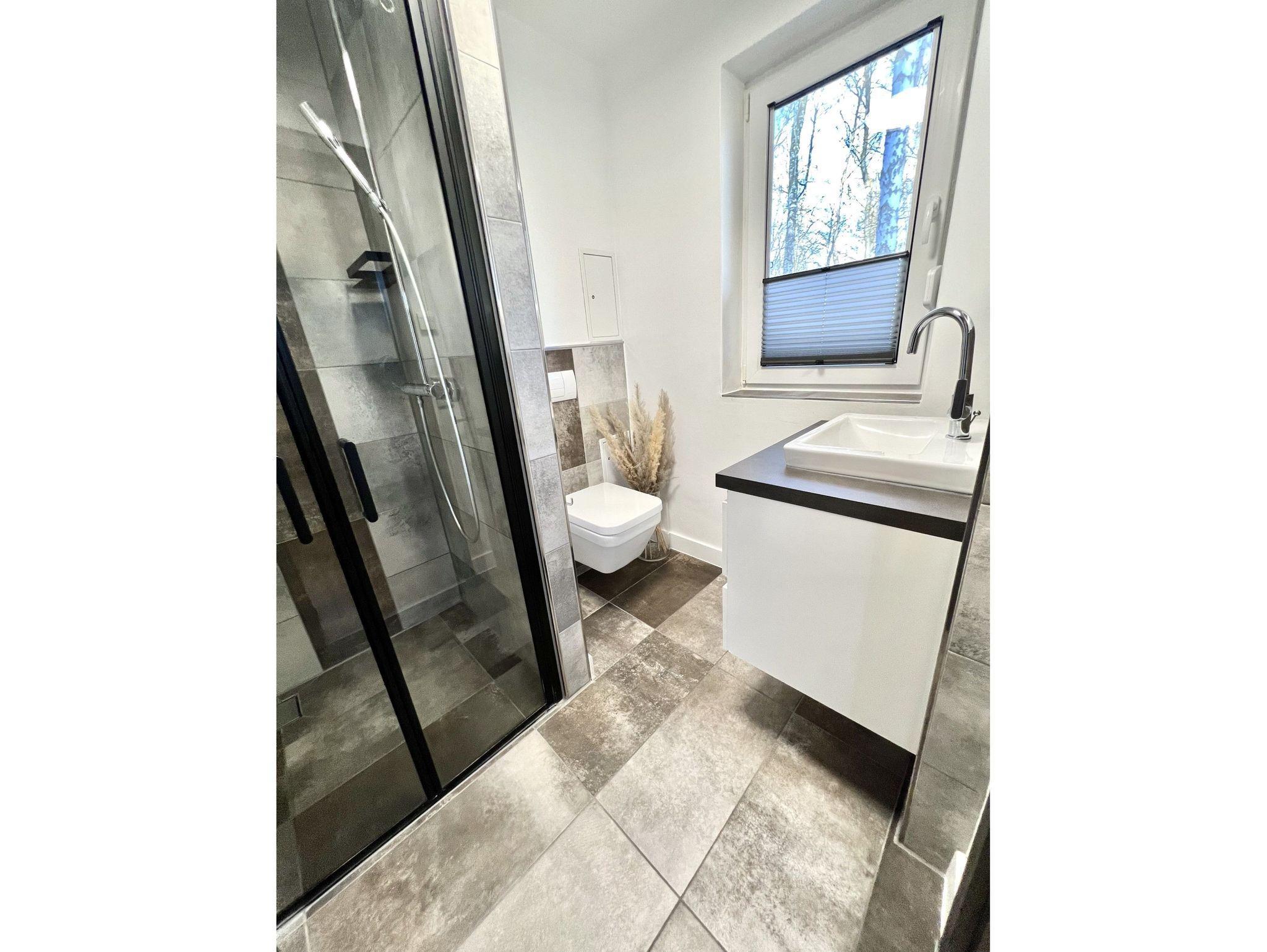 Ebenfalls befindet sich im Erdgeschoß das Tageslicht Badezimmer mit ebenerdiger Dusche, WC, Waschschrank und Fön.