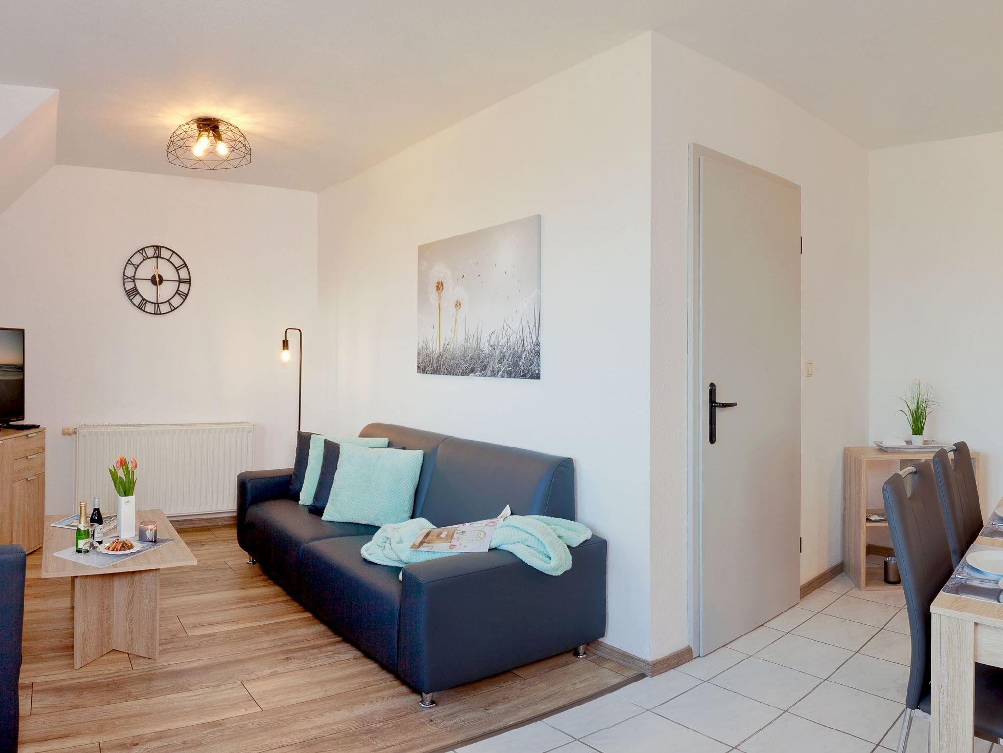 Die Wohnung liegt im EG und verfügt über ein Wohnzimmer mit Couch, Flachbildschirm mit DVD-Player. Schlafzimmer mit Doppelbett, Kleiderschrank, Duschbad mit Fenster. Die Küche ist ausgestattet mit Kühlschrank (inkl. Gefrierfach), Cerankochfeld, Backofen, Spülmaschine, Kaffeemaschine, Wasserkocher, Toaster, Koch- und Eßgeschirr. Die Wohnung hat, außer im Schlafzimmer, eine Fußbodenheizung. Eine große, möblierte Terrasse ist vom Wohnzimmer aus zugänglich. Sie haben einen herrlichen, freien Blick über die Wiesen. Der Parkplatz befindet sich auf dem Grundstück und kostet die Nacht 1,00 €. (Gesetz seit 2017)