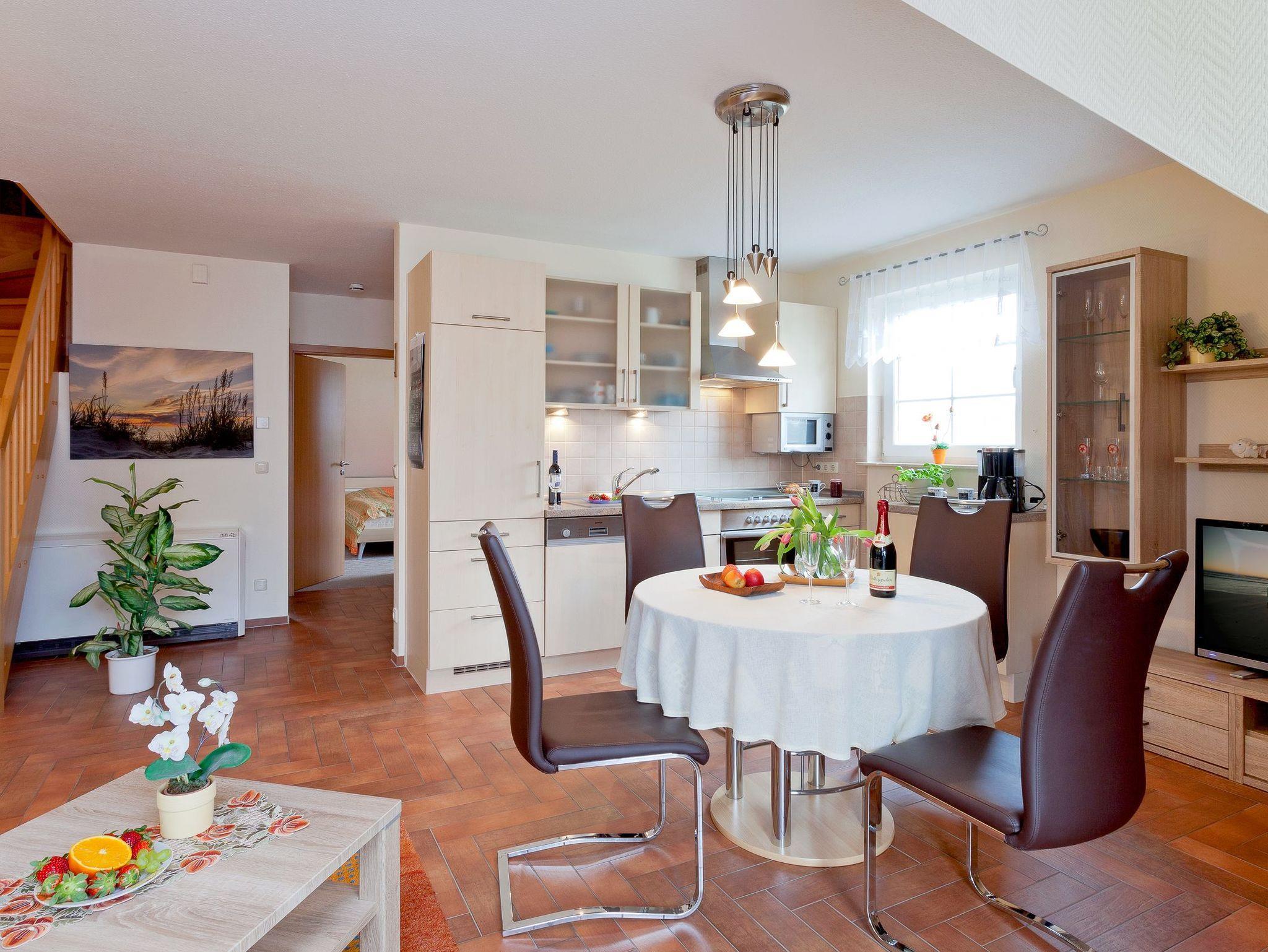 Der großzügige Wohn-Essbereich mit offener Küche bietet eine komfortable Sitzgarnitur sowie einen Flat-TV. Angrenzend befindet sich eine komplett ausgestattete Küchenzeile und ein großer Esstisch mit 6 Stühlen steht Ihnen ebenfalls zur Verfügung.