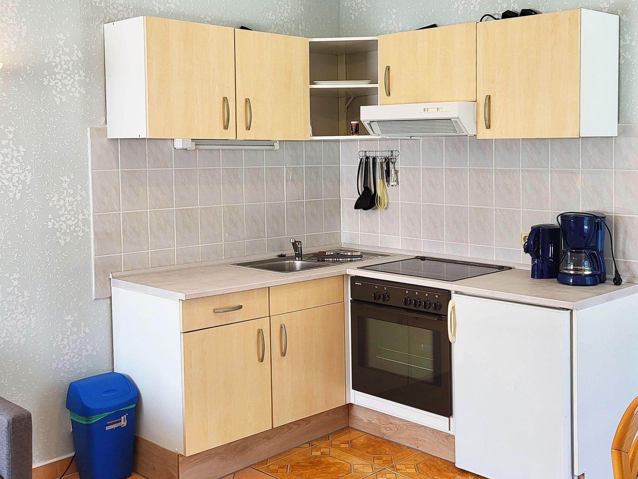 Küche mit 4 Plattenherd, Mikrowelle, Kühlschrank, Kaffeemaschine, Toaster,