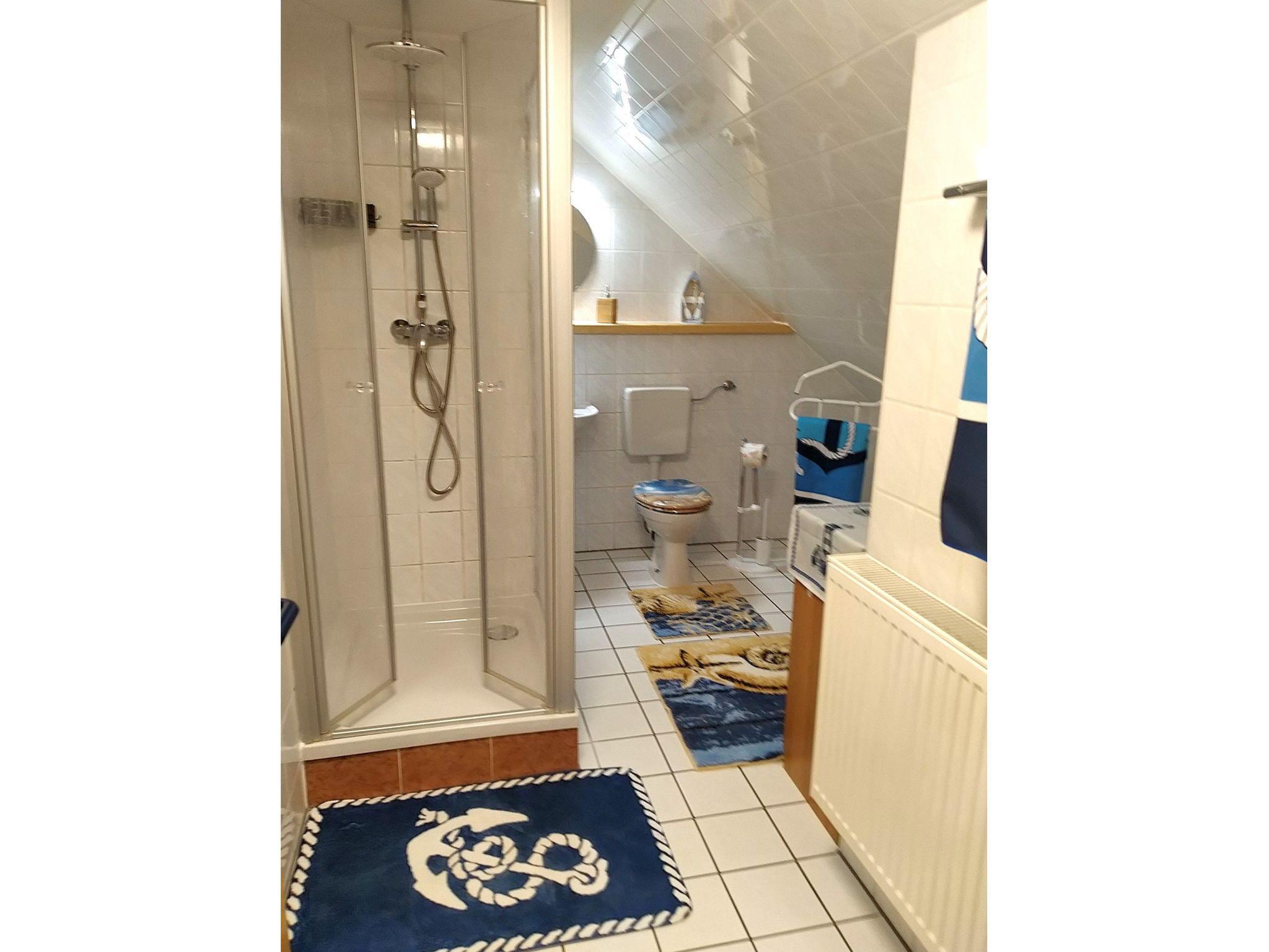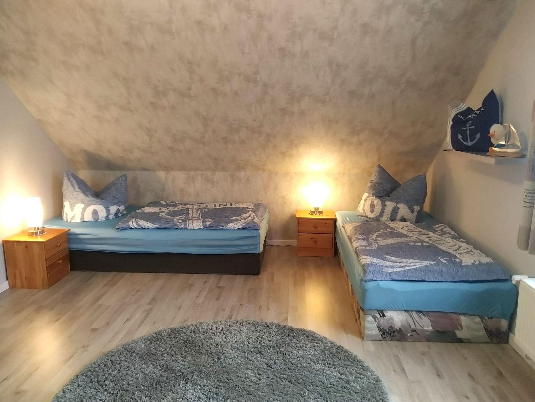 Im großen Schlafzimmer steht Ihnen ein Doppelbett, 2 Einzelbetten, ein Kleiderschrank sowie eine Kommode zur Verfügung. Das Badezimmer verfügt über eine Dusche mit WC (kein Fenster). Ein Haarföhn kann bei den Vermietern ausgeliehen werden. Die Wohnung ist in allen Räumen (außer Bad) mit Laminatfußboden und Teppichen ausgestattet. Die Wohnung ist für Kleinkinder unter 5 Jahren nicht geeignet.