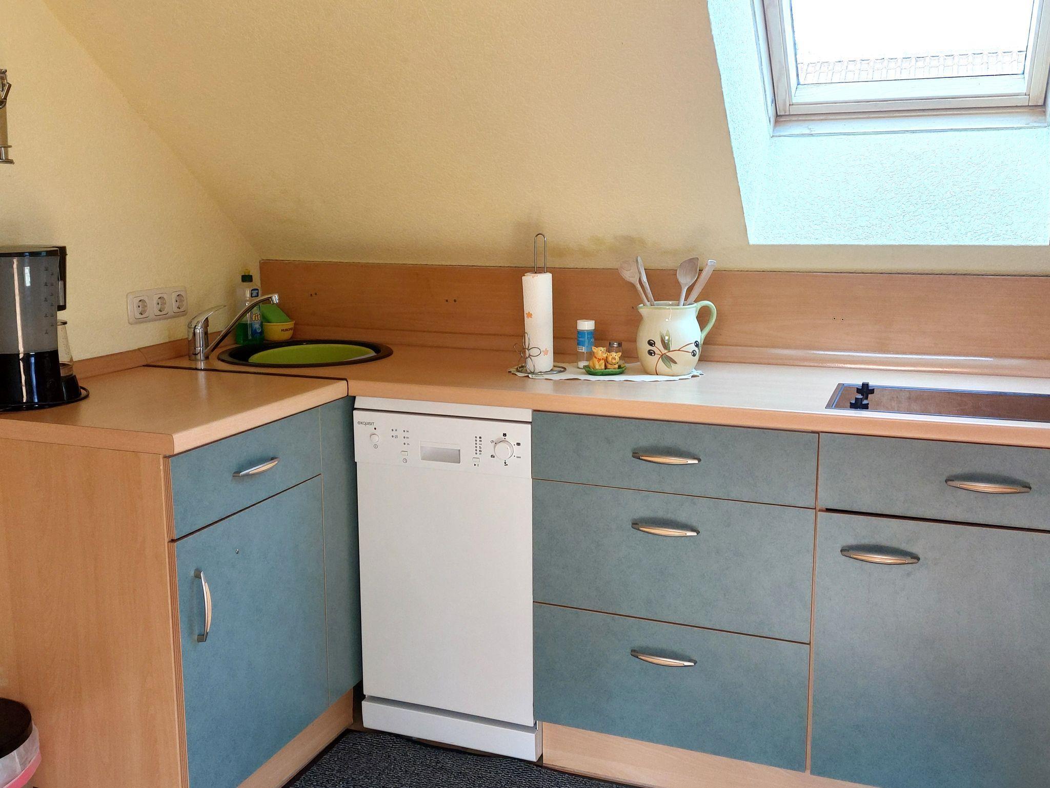 Die kleine Küchenzeile ist ausgestattet mit einen 2-Platten-Cerankochfeld, Mini Backofen, Spülmaschine, Wasserkocher und Kaffeemaschine.