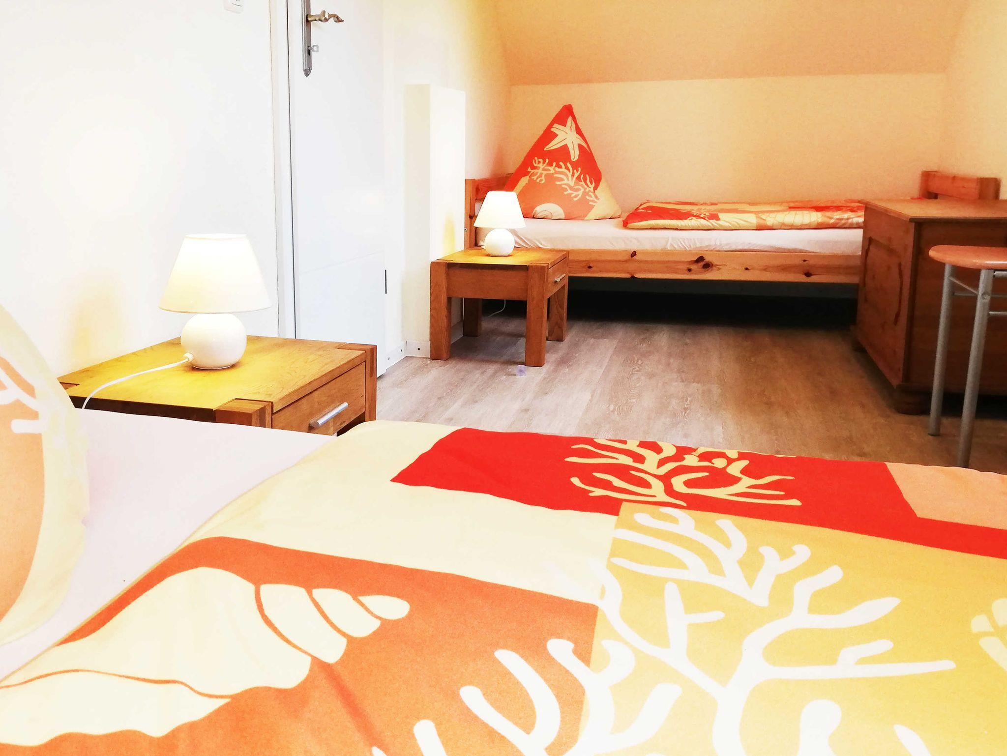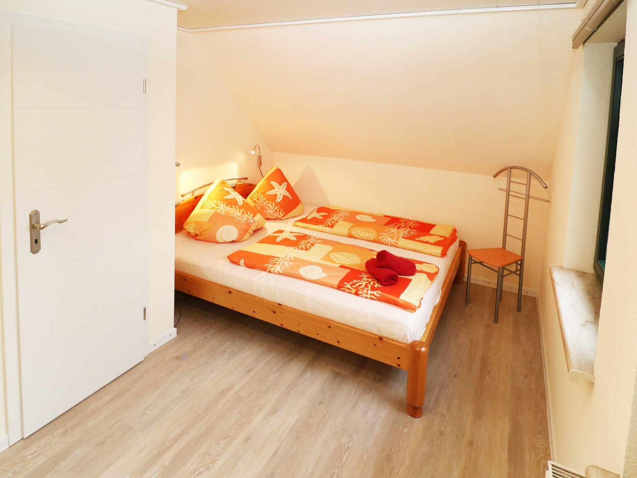 Über eine Ecktreppe im Wohnzimmer geht es in das Obergeschoss mit einem kleinen Flur. Von dort aus erreichen Sie die beiden Schlafzimmer mit einem Doppelbett bzw. zwei getrennt stehenden Einzelbetten. Ein Kinderbett und ein Hochstuhl können kostenfrei hinzugebucht werden.