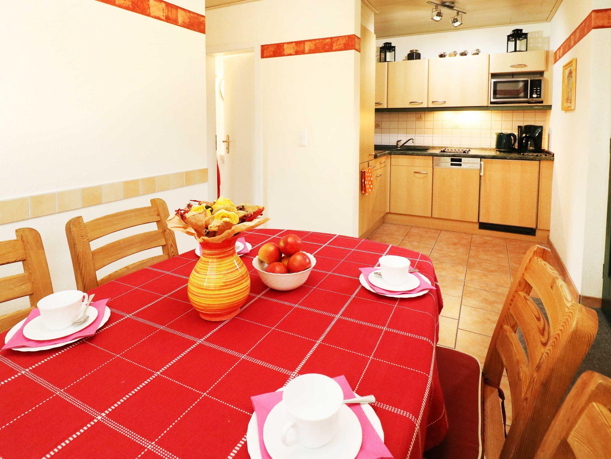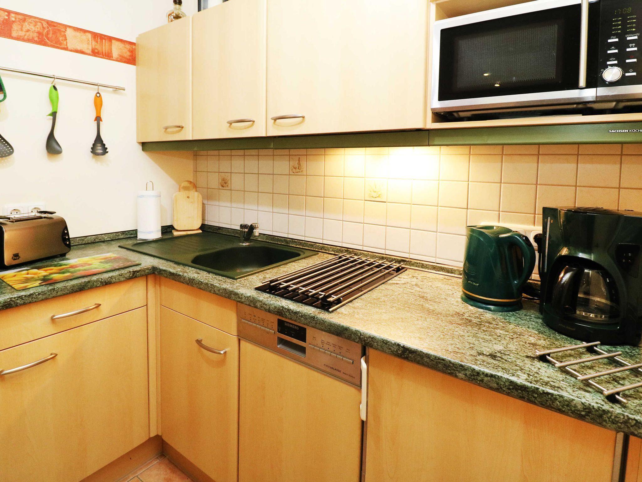 Im Erdgeschoss des Hauses erwartet Sie die vollausgestattete Küchenecke mit eigenem Sitzbereich. Die Küche verfügt über ein Cerankochfeld mit 2 Kochstellen, Geschirrspüler, Kühlschrank mit Gefriermöglichkeit, Mikrowelle, Kaffeemaschine, Toaster und Wasserkocher.