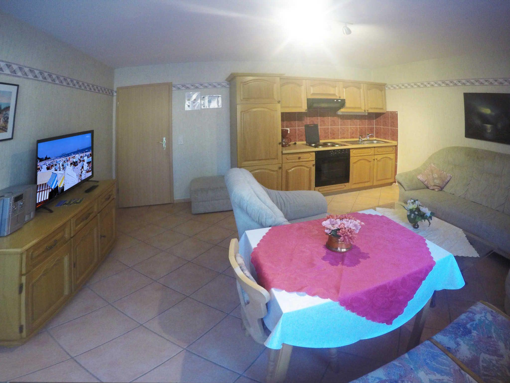 3 Raum-Wohng., 2 SZ (1 DB, 2 EB für Kinder 5-17 J.) Küche, Wohn Bad mit Dusche/WC, Flur, Balkon, Terrasse, Haustiere nur auf Anfrage! Frühstücksbüfett mit Voranmeldung möglich und auch Abendessen à la carte.