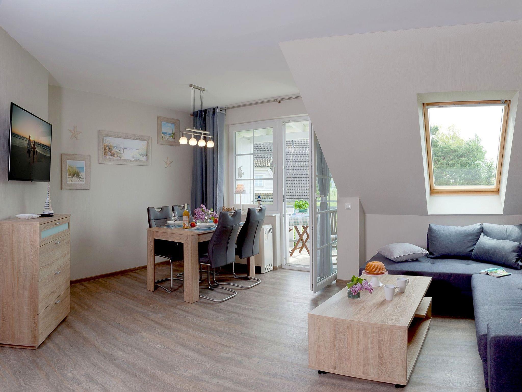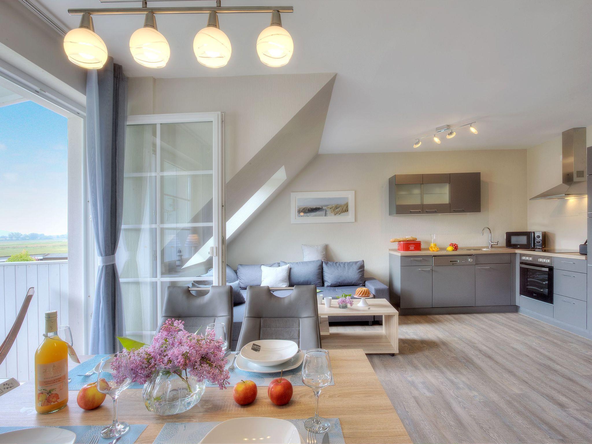 Der großzügige Wohn-Essbereich mit offener Küche lädt zum Entspannen ein und bietet eine komfortable Sitzgarnitur sowie einen Flachbild-TV. Die komplett ausgestattete Küchenzeile lässt keine Wünsche offen. Ein großer Esstisch mit 4 Stühlen steht ebenfalls für Sie bereit.