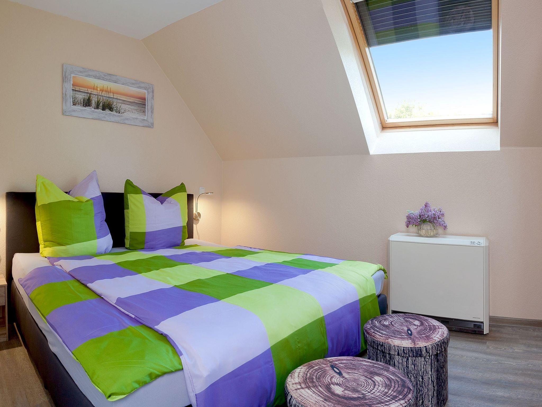 Sie bietet zwei separate Schlafzimmer im Obergeschoss, eines mit einem großzügigen Doppelbett und das andere mit zwei gemütlichen Einzelbetten. Das Badezimmer ist modern ausgestattet mit einer Dusche, WC und Fußbodenheizung.