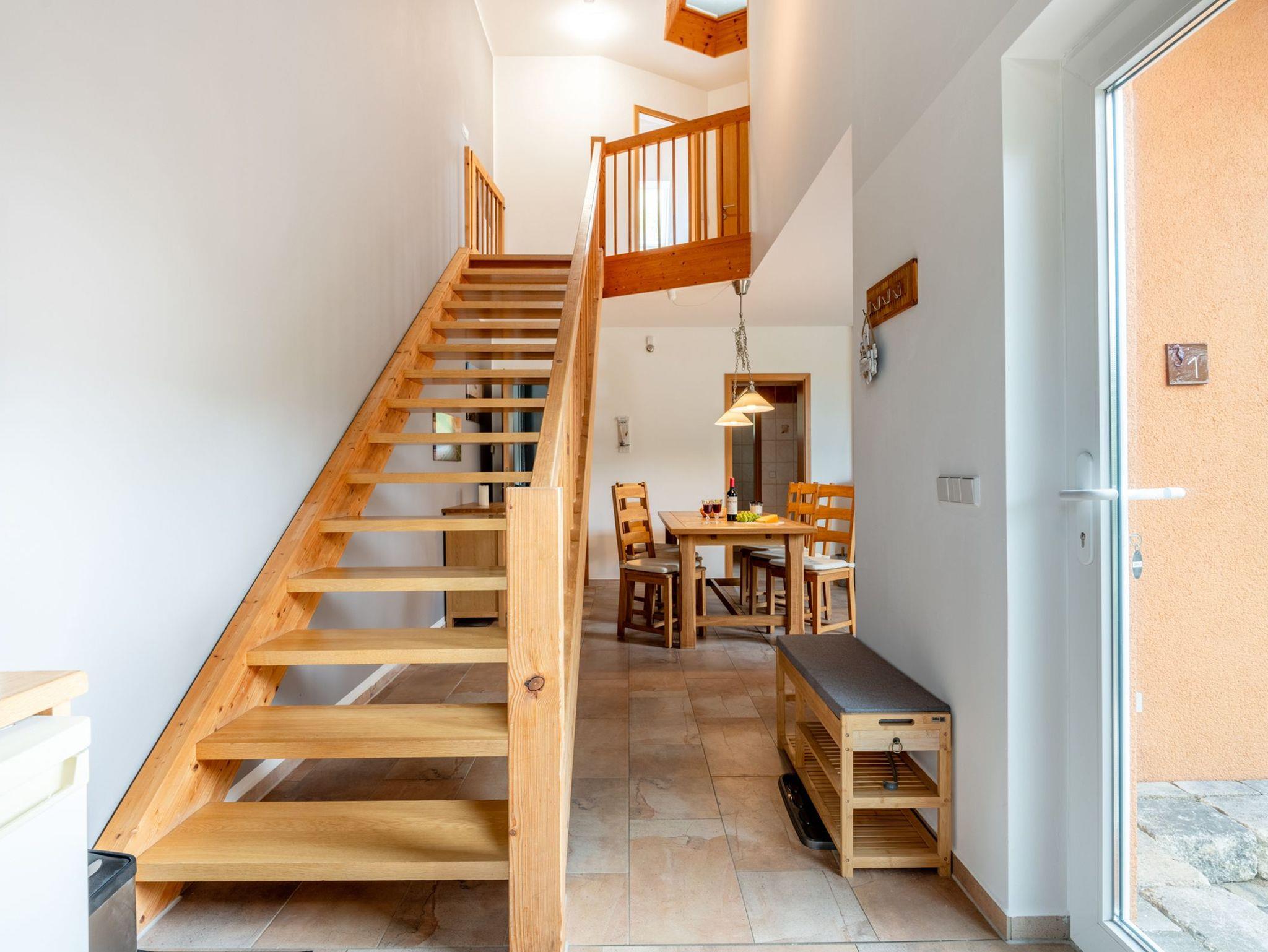 Im Erdgeschoss befindet sich der Wohnbereich mit Kaminofen, bequemer Sofaecke und direktem Zugang zur Terrasse. Die offene Küche ist vollständig ausgestattet mit Geschirrspüler, Backofen, Mikrowelle, Kühlschrank mit Gefrierfach, Kaffeemaschine und großem Esstisch.