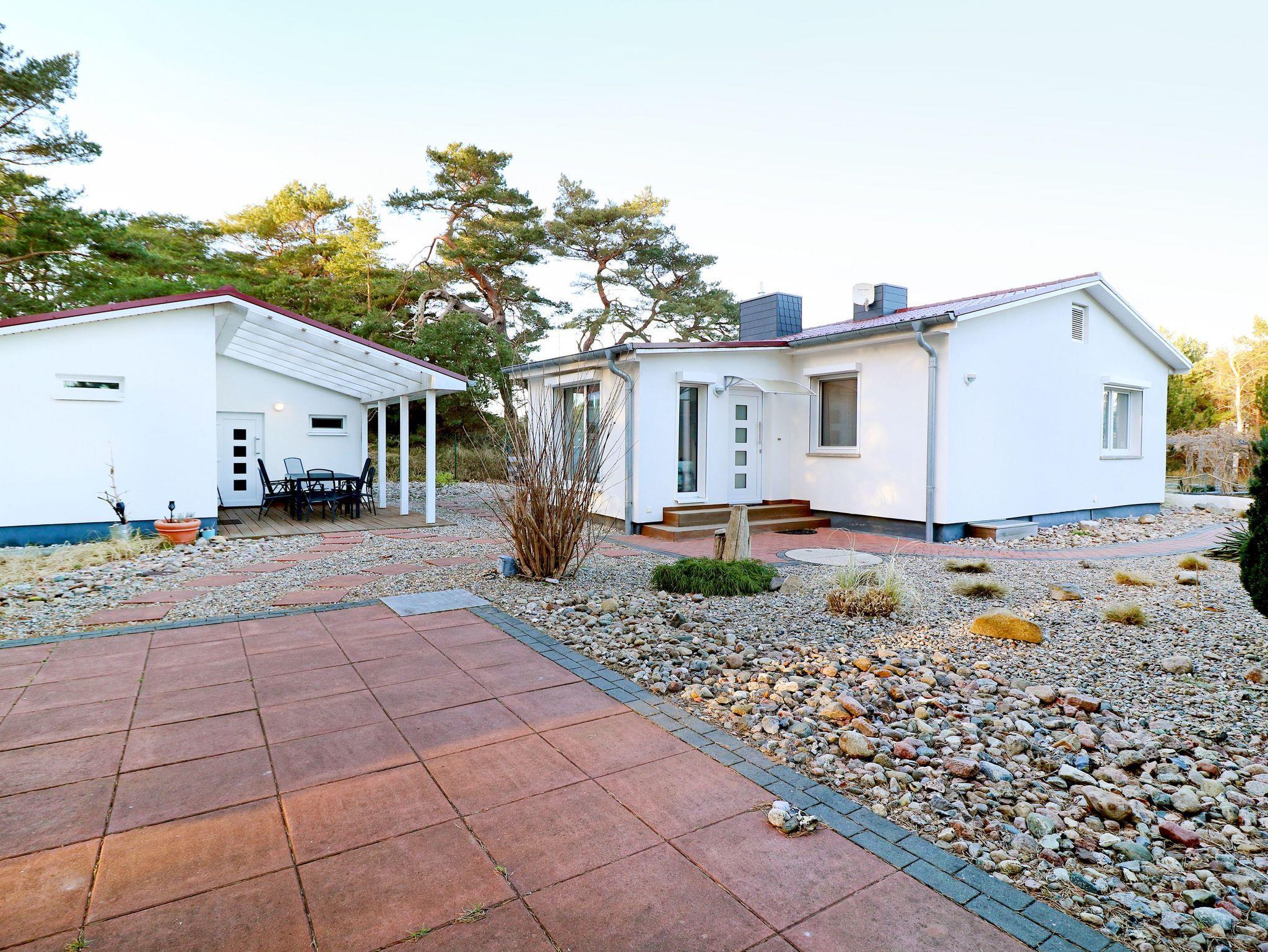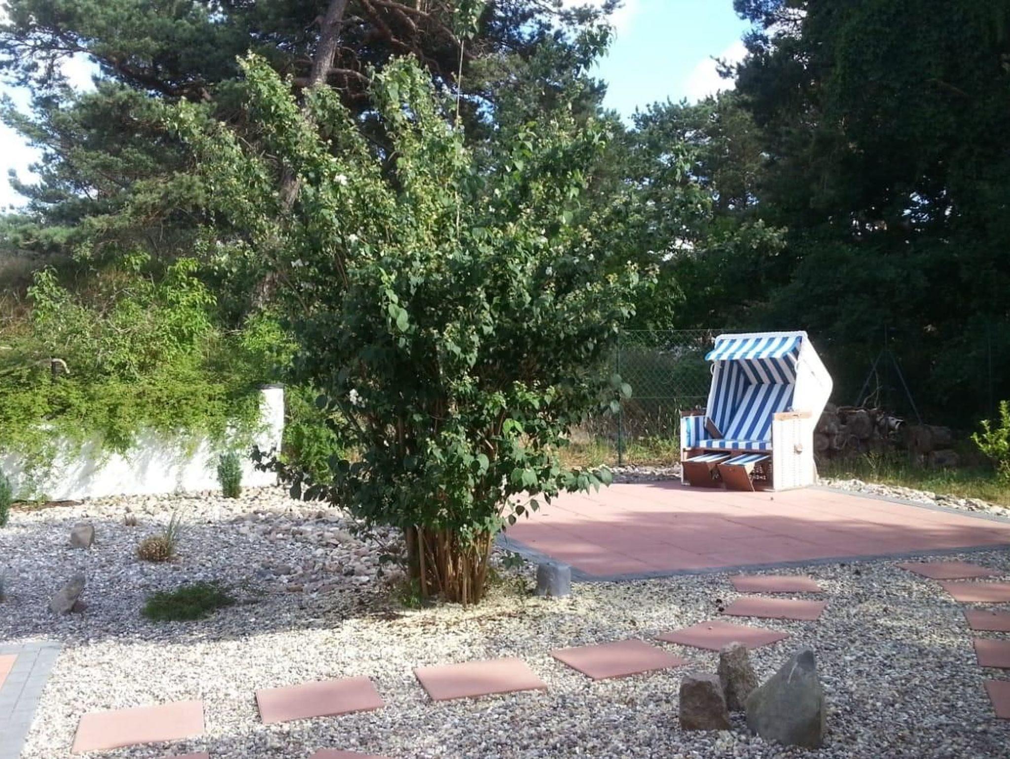 Die überdachte Terrasse mit Gartenmöbeln lädt zum Verweilen und zum gemütlichen Beisammensein ein. Im Garten darf grillt werden. Ein Grill ist vorhanden und muss selbst gereinigt werden. Eine kleinere Terrasse mit Strandkorb (nur von Mai bis Oktober) befindet sich auf dem hinteren Teil des mediterran gestalteten Grundstücks.