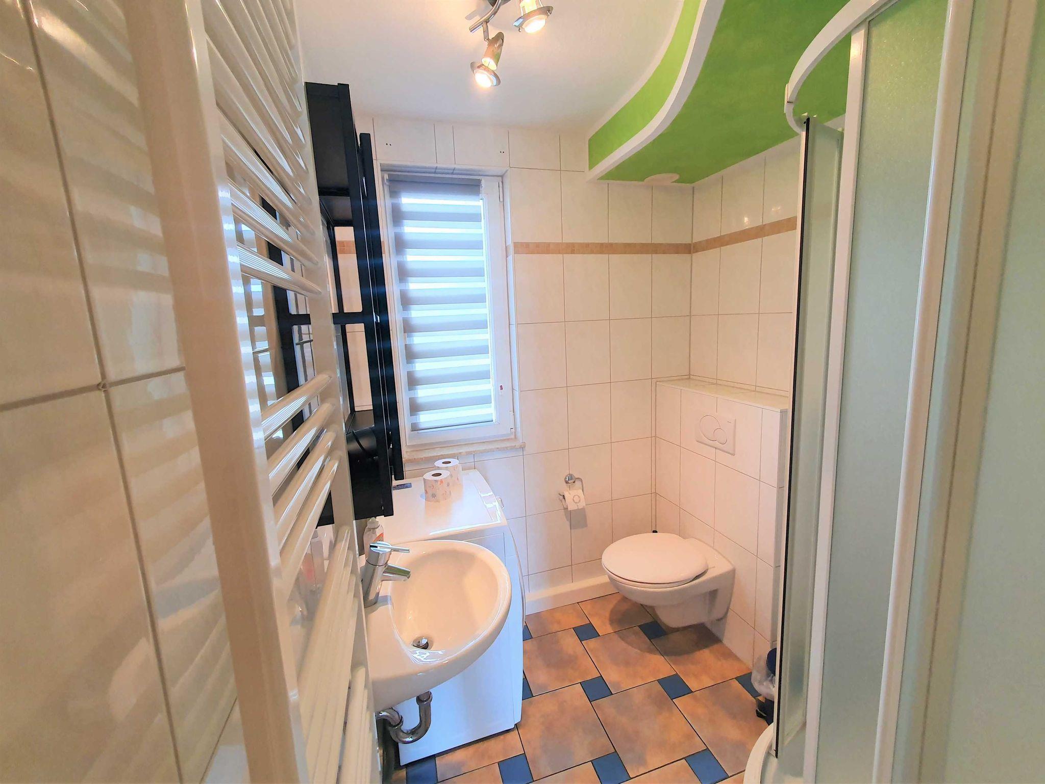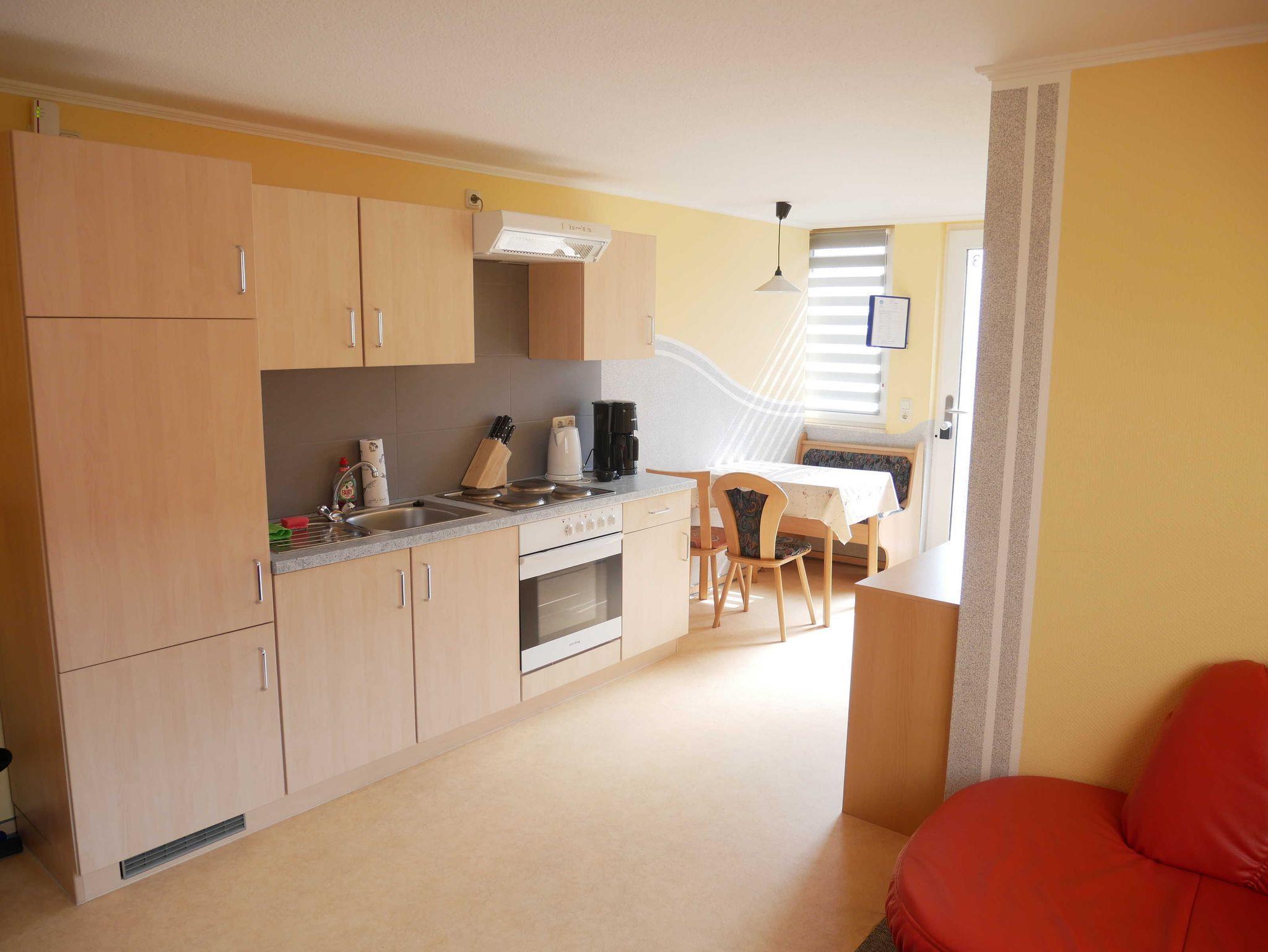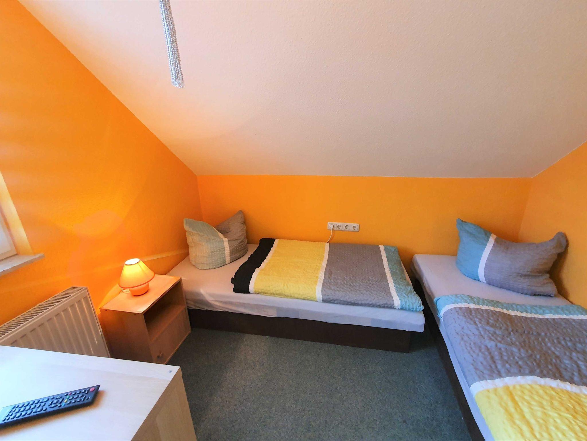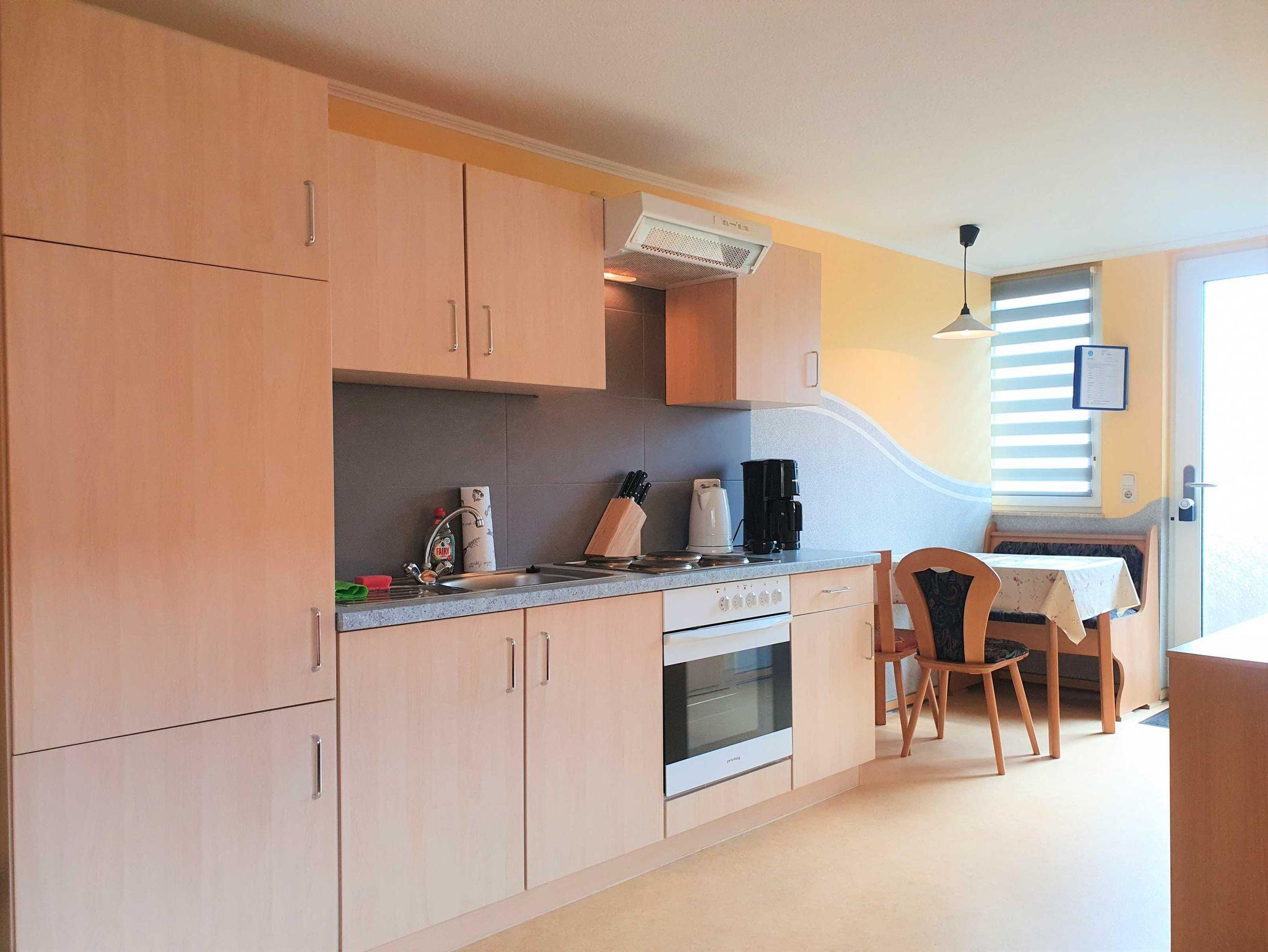 Die Ferienwohnung befindet sich im 1. OG und ist über eine Außentreppe zu erreichen. Sie verfügt über zwei Schlafzimmer (1x Doppelbett, 1x 2 Einzelbetten und zus. TV), einer voll ausgestatteten Küche mit Backofen, Kühlschrank mit Gefrierfach, Wasserkocher, Toaster und Kaffeemaschine. Der Wohn- und Essbereich verfügt über einen Flat-TV und einen Kamin für gemütliche Stunden. Das Badezimmer ist mit Dusche/WC, Waschmaschine und Fön ausgestattet. Die Fußböden sind teilweise mit Teppich im Wohn- und Schlafbereich, mit Linoleum im Küchen- und Essbereich und mit Fliesen im Bad ausgelegt. Die Wohnung hat eine separate Sitzmöglichkeit im Außenbereich. Ein PKW-Stellplatz und WLAN stehen Ihnen kostenfrei zur Verfügung.