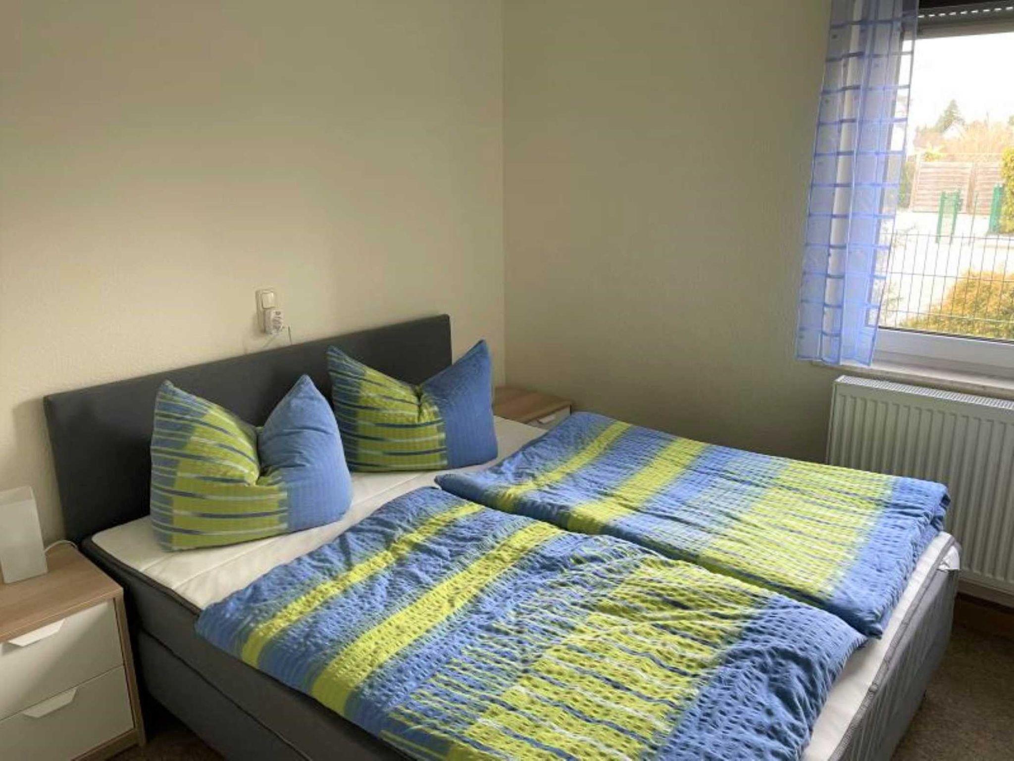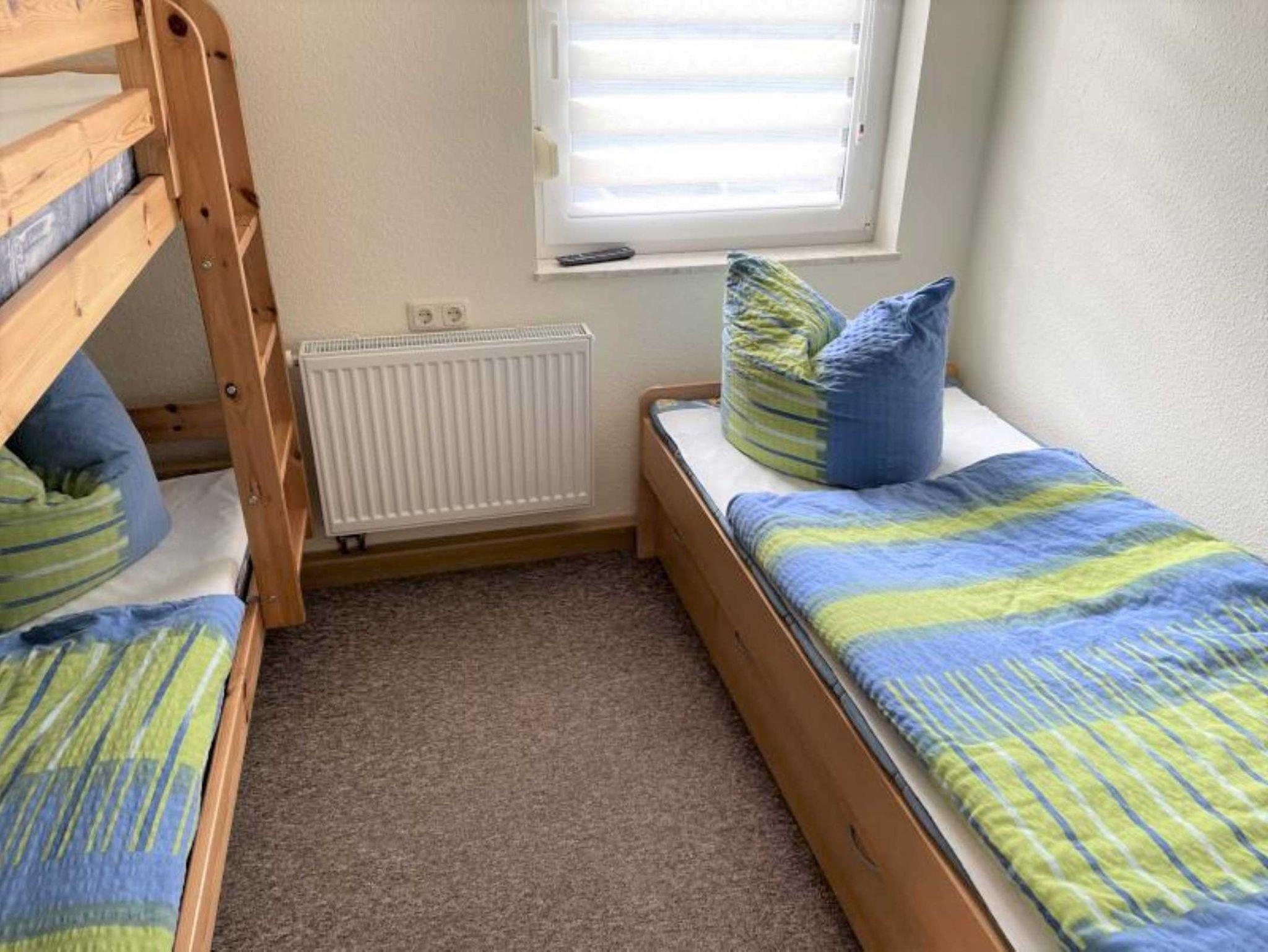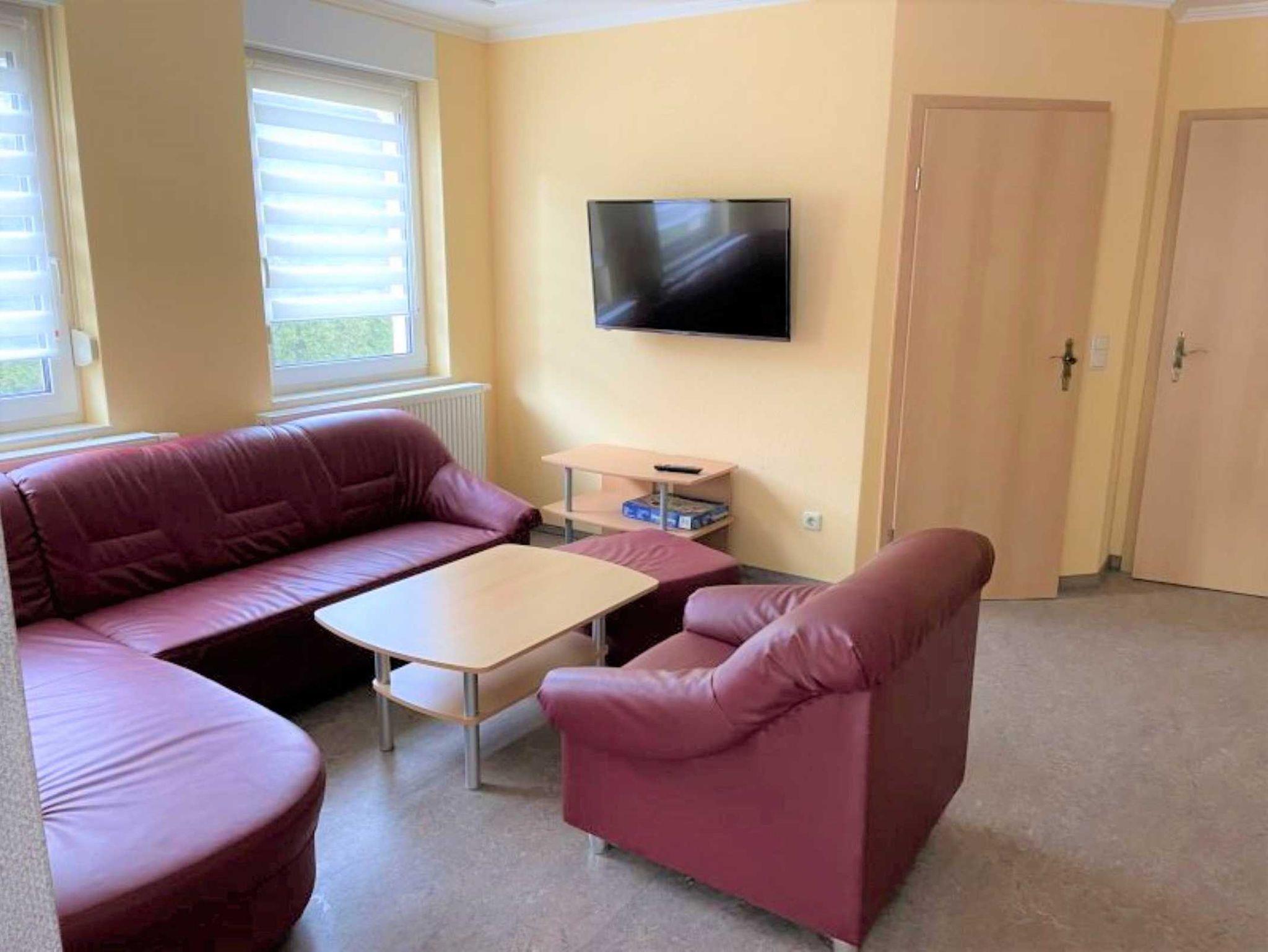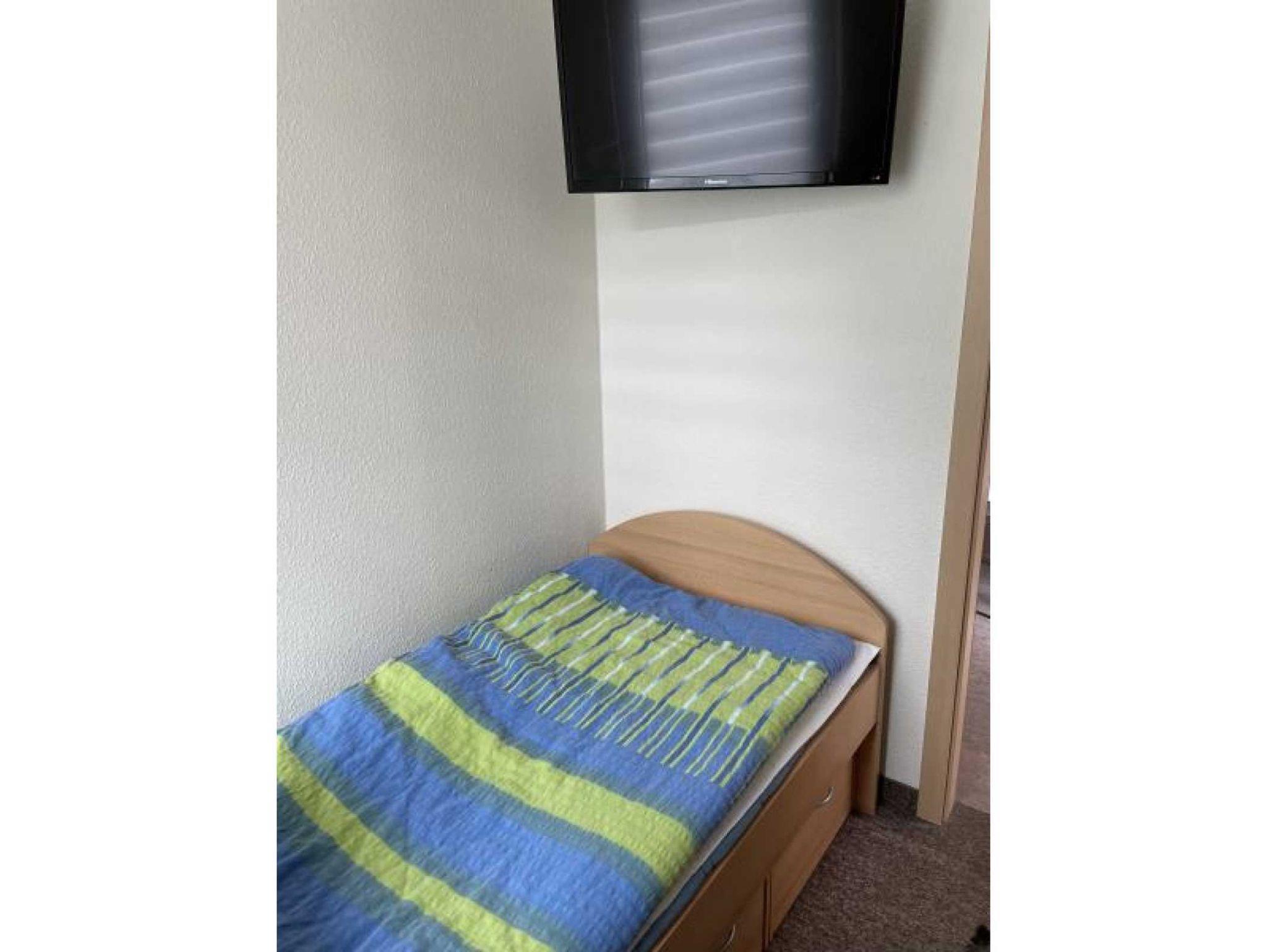 Die Ferienwohnung verfügt über 2 Schlafräume (1x Doppelbett, 1x Etagenbett & 1 Einzelbett und zus. TV), einer voll ausgestatteten Küche mit Backofen, Kühlschrank mit Gefrierfach, Wasserkocher, Toaster und Kaffeemaschine. Der Wohn- und Essbereich verfügt über einen Flat-TV für gemütliche Stunden. Das Badezimmer ist mit Dusche/WC, Waschmaschine und Fön ausgestattet. Die Fußböden sind teilweise mit Teppich im Wohn- und Schlafbereich, mit Linoleum im Küchen- und Essbereich und mit Fliesen im Bad ausgelegt. Die Wohnung hat eine separate Sitzmöglichkeit im Außenbereich. Ein PKW-Stellplatz und WLAN stehen Ihnen kostenfrei zur Verfügung.