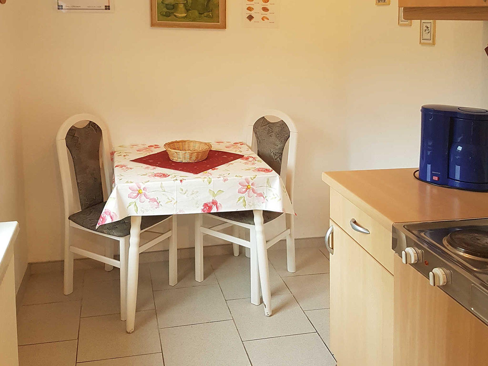 Küche mit 2 Plattenherd, Mikrowelle, Kühlschrank, Kaffeemaschine, Toaster,