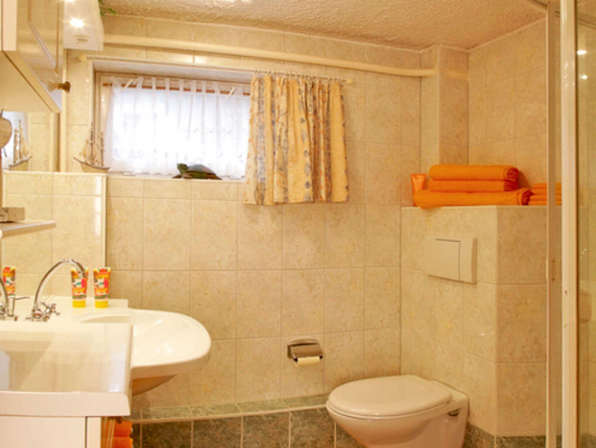 Das Bad ist mit einem großen Waschtisch mit Spielkombination , einer Dusche und WC nutzbar.