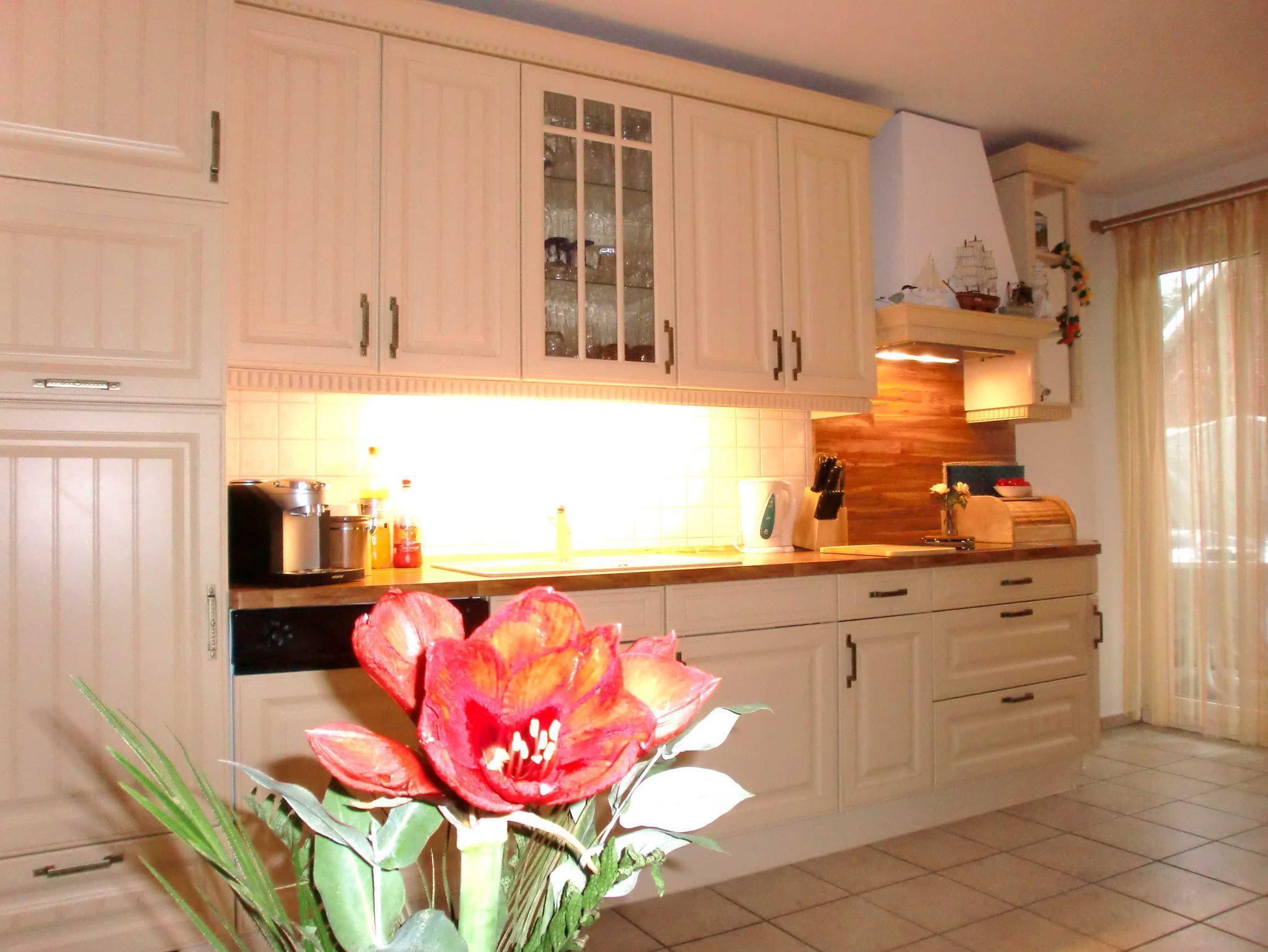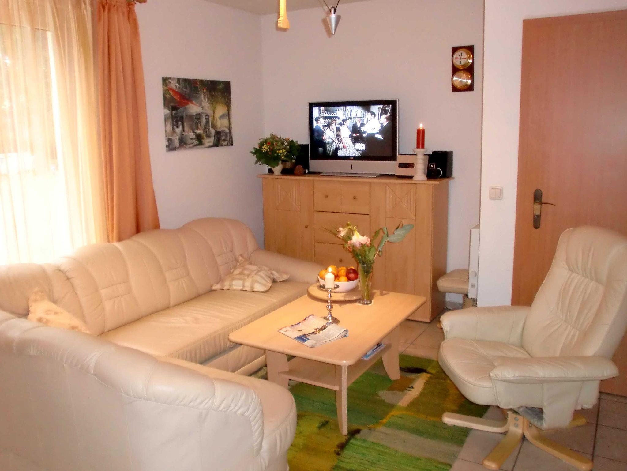 Es ist eine moderne Wohnung im mediterranem Stil, 56 qm groß, mit zwei Schlafzimmern und einem Wohnzimmer mit Küchenzeile, komplett eingerichtet. Im Wohnzimmer gibt es einen Esstisch mit 5 modernen Sesseln, eine Couch mit Couchtisch und ein Sideboard, auf dem eine Stereo-Anlage mit Rundfunk und ein Flachbild-Fernseher (81 cm) stehen. WLAN steht Ihnen in dieser Wohnung kostenfrei zur Verfügung.
