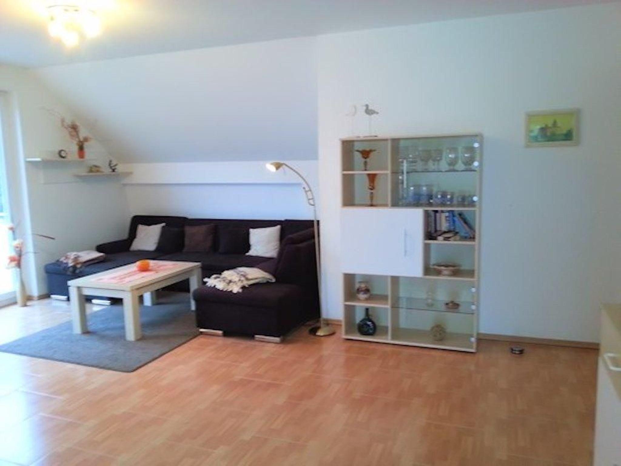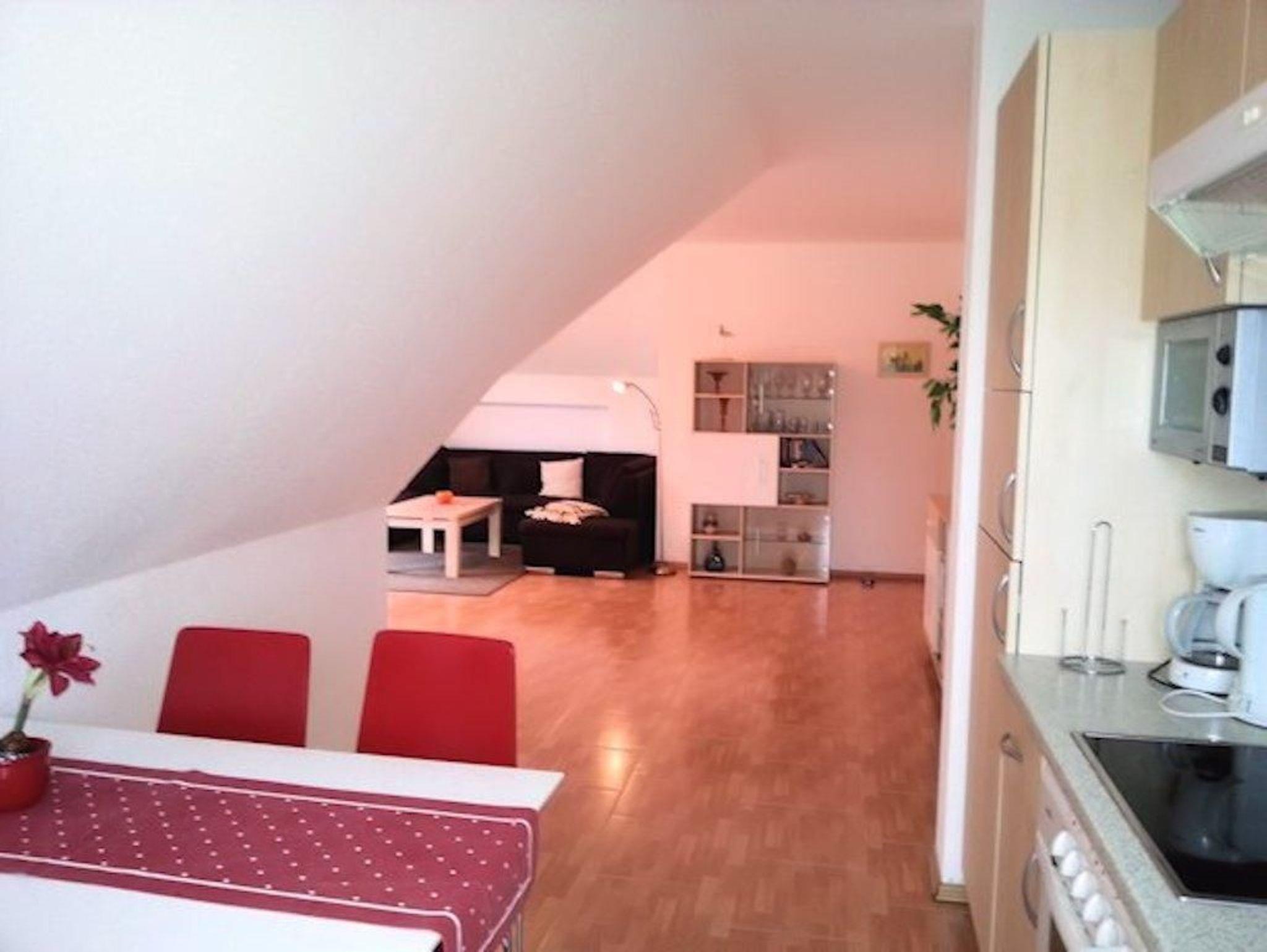 Die 3-Raum-Wohnung verfügt über einen komfortablen Wohnbereich mit Sitzecke und Flachbild-TV. Vom Wohnzimmer aus gelangt man zur Küchenzeile, der sich ein Essplatz für 4 Personen anschließt. Der Wohn- / Küchenbereich ist liebevoll in das Dachkonzept integriert.