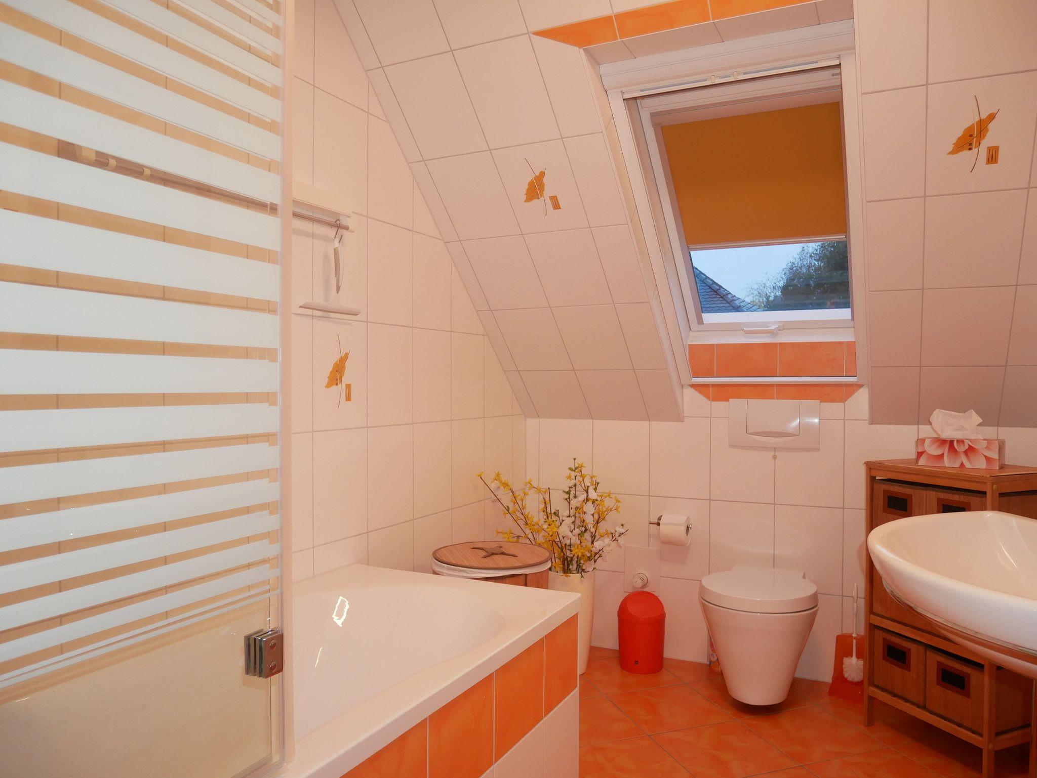 Das Badezimmer ist ausgestattet mit einer Badewanne mit Duschabtrennung, WC und Fön. Eine Etage höher befindet sich ein kleines Wohnzimmer mit einer gemütlichen Couch und einen weiteren Fernseher. Dieser Bereich ist über eine steile Raumspartreppe zu erreichen.