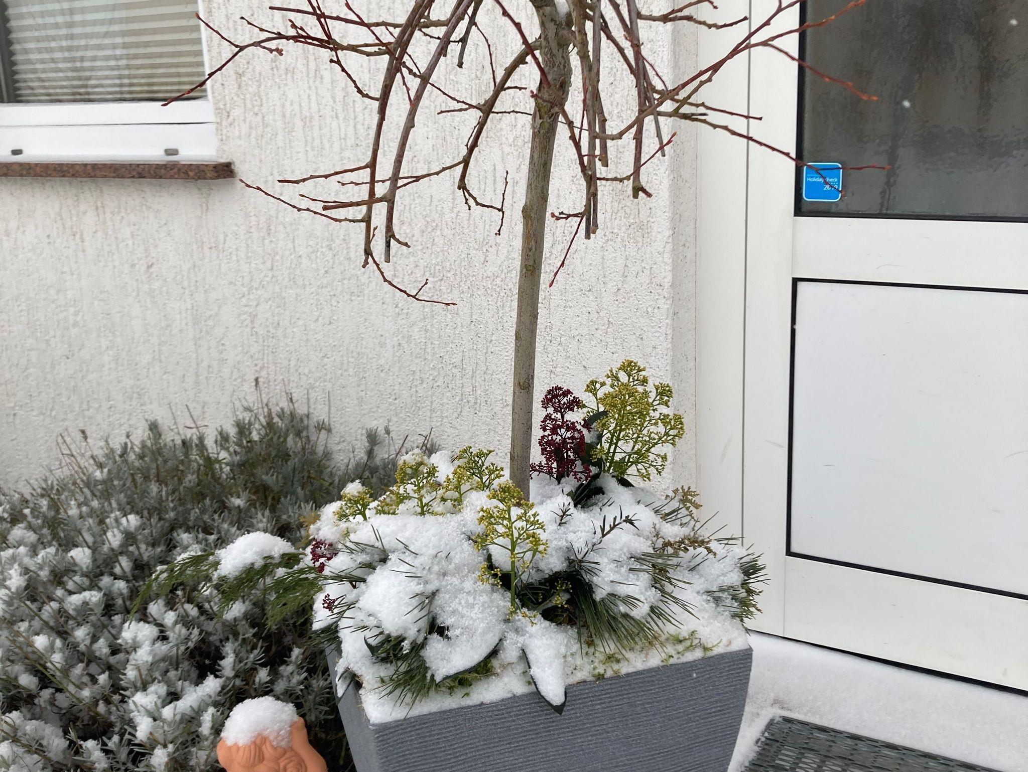 • kleine Terrasse mit Sitzgarnitur und Sonnenschutz
